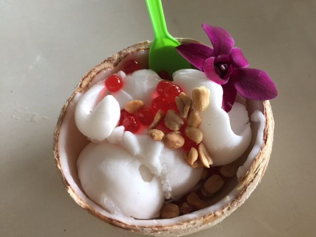 水上マーケットに降りるとお土産やさんがあり、食べ物を売ってる場所もありました。私はなぜかボートに乗ってるときから、ココナッツアイスクリームを売ってるおばちゃんと目が合って、手招きされていたので、ボートを降りた途端、吸い込まれるようにそこのおばちゃんのところに行って、アイスクリームを買いました。とっても美味しかったです。ココナッツが苦手だから、自分はいらないと言っていた主人も、一つしか買ってないのに、美味しいと言ってやたら食べてました。オススメです。