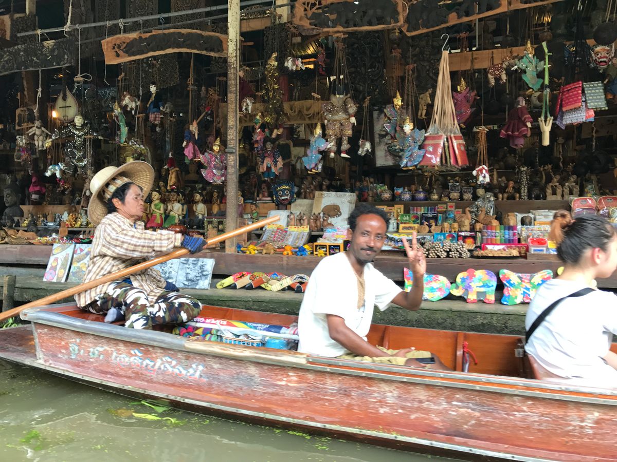先にジェットボードに乗りました。街をすいすい進んで楽しいです。そのあと、手漕ぎのボードに。追加で1人200Bで、希望者は乗ることができます。水上マーケットの手漕ぎボードはここならではの風景を味わえるのでおすすめです。乗った方がいいです。商品は全体的に高いので、大幅に値切るのがお得です。私はタイパンツを200Bで購入しました。