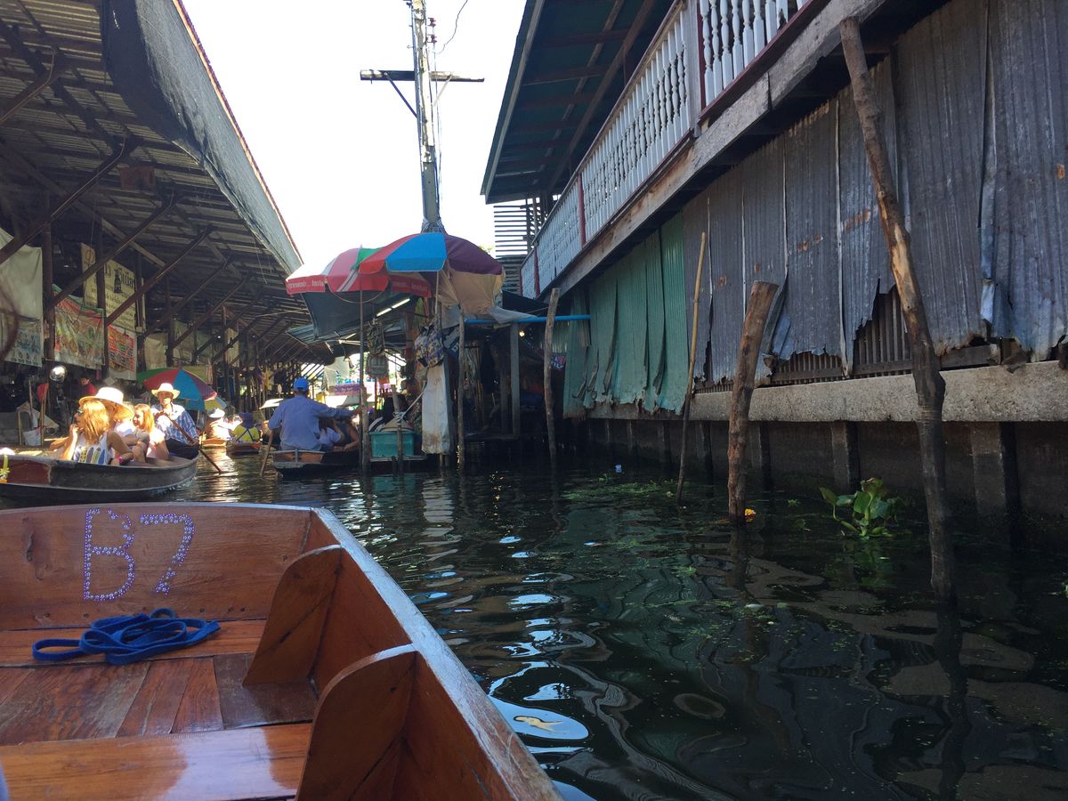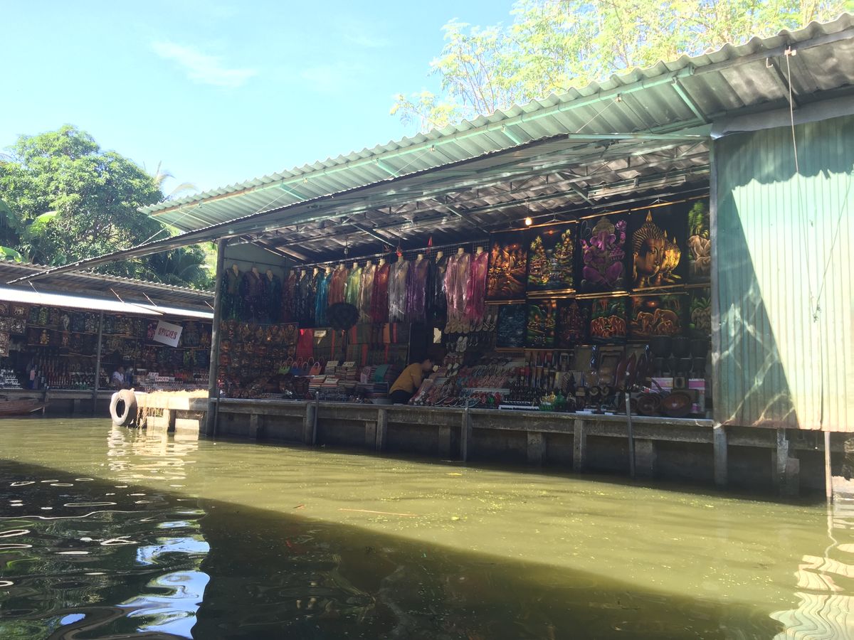 その後は手漕ぎボートに乗りました。おばさんが漕いでくれました。私のときは200バーツでした。店の付近になると店主が棒を使って引き寄せてきますので,いらないときはきっぱりいらないと言ったほうがいいかも。価格はとても吹っかけてくるので,買い物したいときは値引き必須です。最低でも半値以下から始めないと,めちゃぼられます!