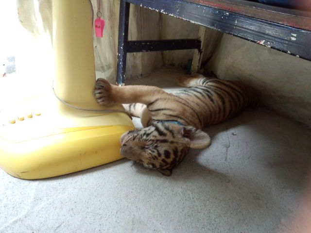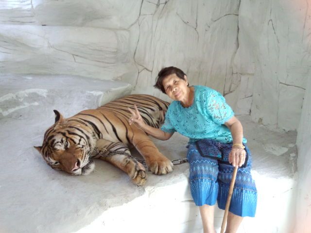 象乗り場脇の、小部屋に大きな虎と、子虎が、寝転がってて、言われた金額200Bで、沢山写真撮れましたが、ネットで見ると50B,100Bの方もいたので、ペーン、ロッタイマイカーと言っておけば、良かったですが、サービスも良く、虎親子に美味しいものを食べさせてもらえれば、良しとします。