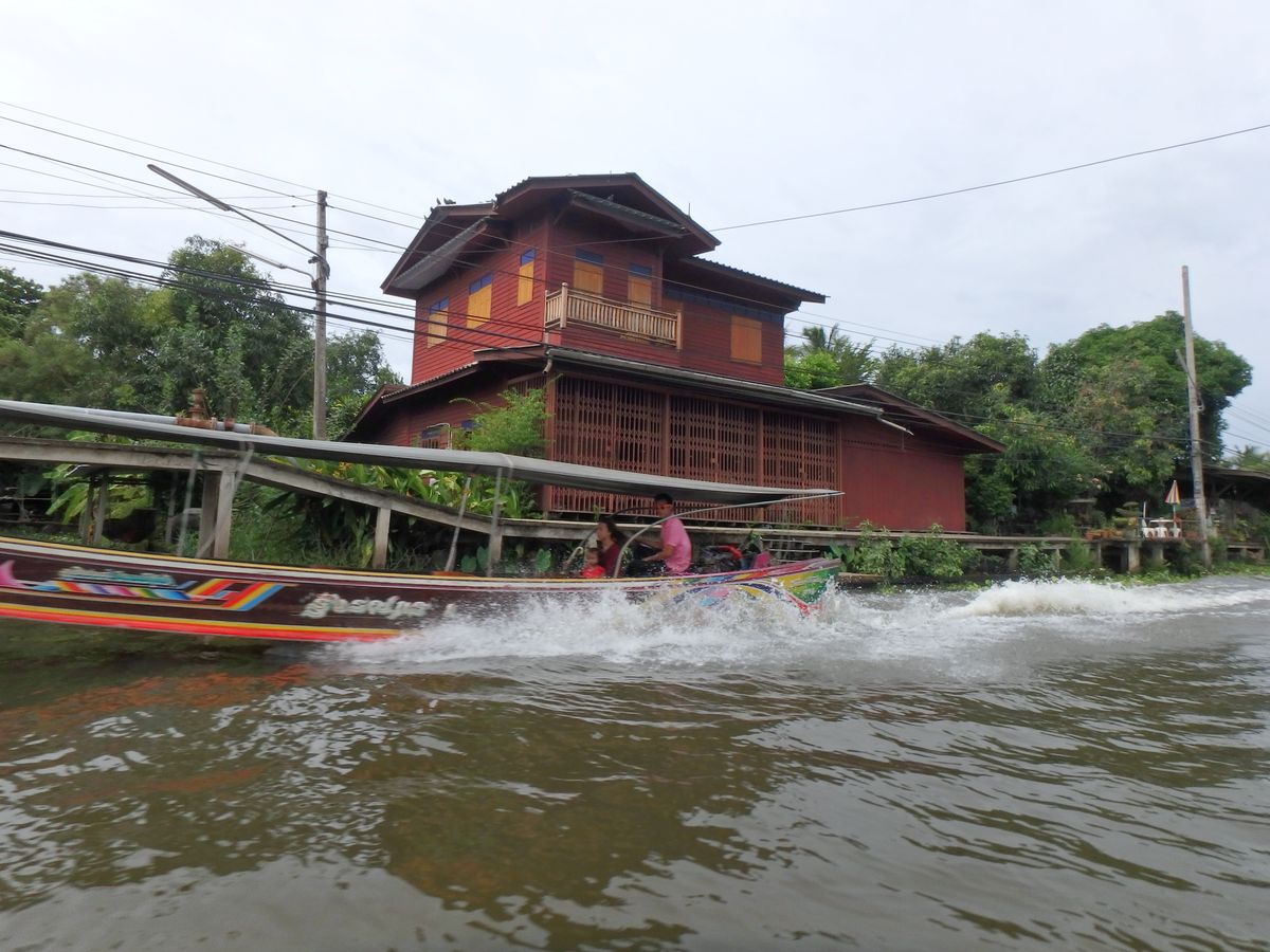 スピードボートで水上マーケットへ向かう道中、生活の場である家屋を見て、都市と地方の違いを色々と感じ入ります。終点では土産物さんしかなく、向こう岸にも渡れないので、出発までの時間、手漕ぎボートに乗ることをお勧めします。ボードの大混雑模様は、ここならではです。