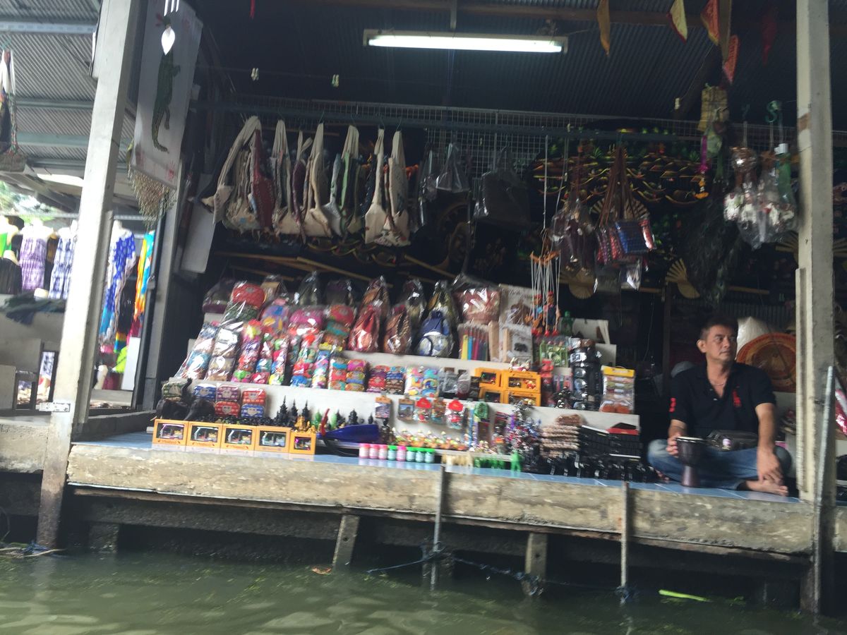 モーターボートにしばらく乗って水上マーケットに到着。スピードがとても速く風が気持ちよく爽快でした。一人200Bで手漕ぎボートに乗れるとのことだったのでツアーのほかの方と4人ずつに分かれ船に乗りました。食べ物にお土産にたくさんのお店が並び、水上マーケットの雰囲気が存分に味わえて乗っているだけでとても楽しかったです。私が参加したのは月曜だったので比較的空いていましたが、土日はとても混みあうとのことでした。
