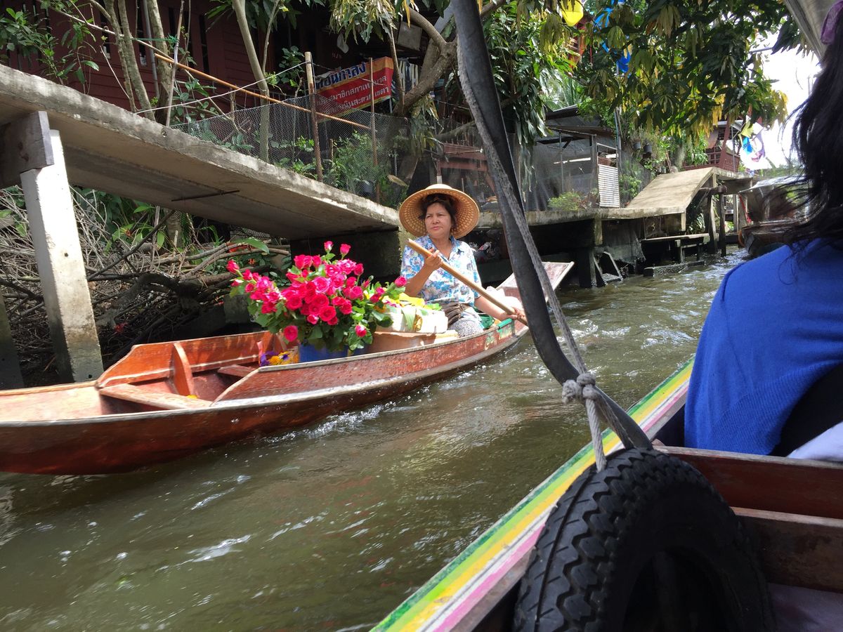 高速ボートを降りたあと1時間程の自由時間があり、買い物の他にも、ひとり200THBで手漕ぎボート(20分間)に乗ることができます。他のグループの方との相乗りだと船の上からの買い物は難しいかもしれませんが、高速ボートよりも奥まで行くことができてオススメです。