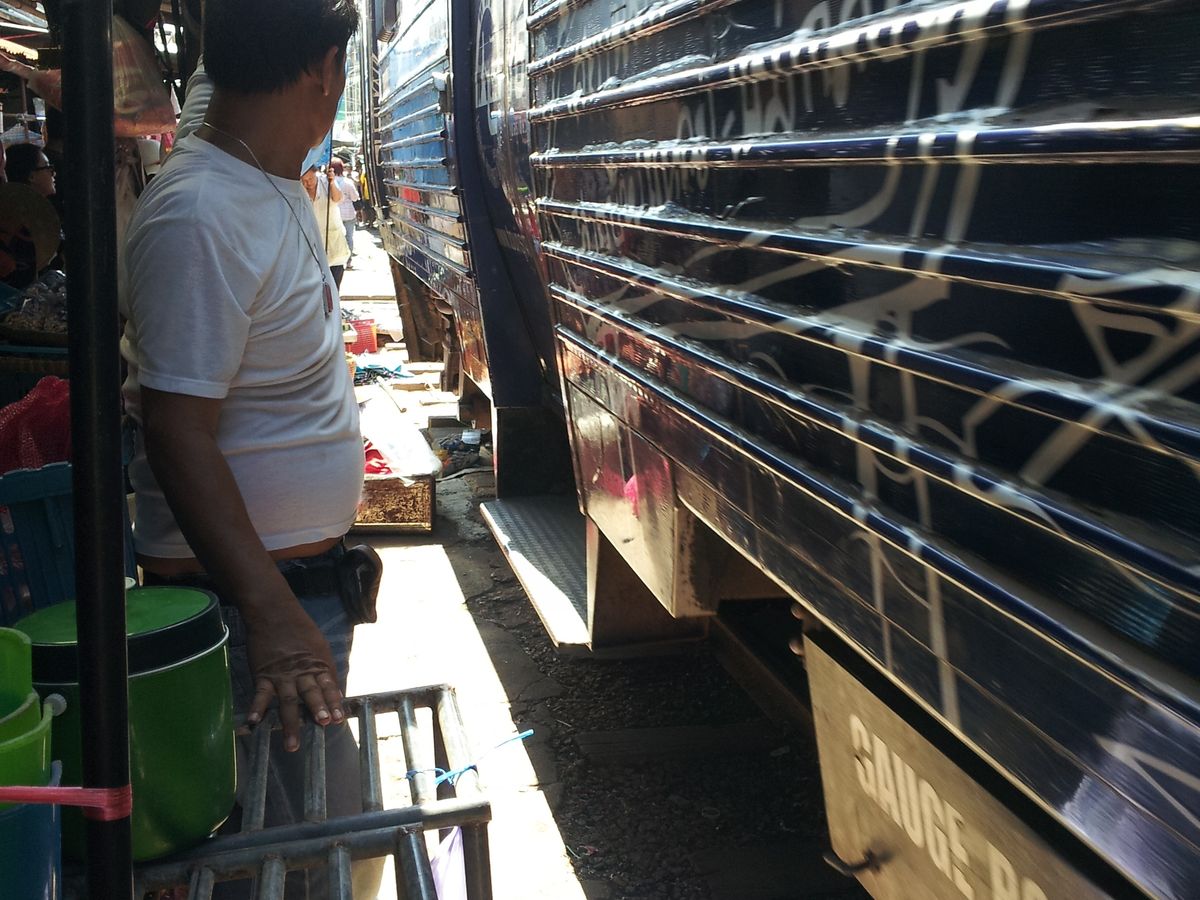 線路の両脇を市場のお店ではさんでいて、列車が来ると一時的に店をたたんで、通り過ぎたらまた店を開くという、一連の流れを見ることができました。列車がお店すれすれを走っていて迫力満点でした。