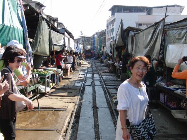 メークローン市場、TVで見て興味をもって、参加しました。電車が来るまでは、市場見学。生ものばかりなので購入するものはありませんでした。電車が通るときに、電車をバックに写真に写ろうと、お店とお店の間で待機していたのですが、電車が近づくと、お店の商品をスルリと内側に引き込むと同時に、日さしを下ろして、垂れ幕状態に。隙間が殆ど無く、写真は撮れませんでした。電車が過ぎると、また直ぐに、店開き。ほんとに素早い行動でした。水上マーケットでは、皆それぞれ買い物。値切って買って喜んでいたのも束の間。あとで、ショッピングセンターのお土産屋でもっと安く売っていました。それも良い思い出。