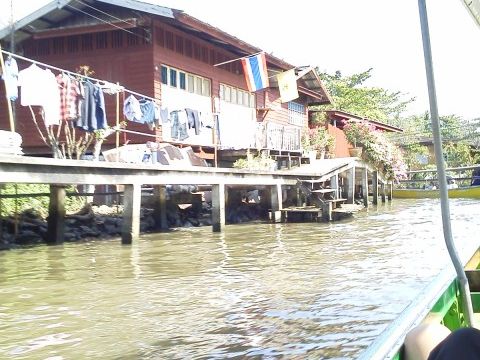 水上マーケットへの移動で乗ったモーターボート。爽やかな風をうけ水辺で暮らす人々の様子を見ることができ思い出に残るものでした。8人全員がもう少し乗っていたいというくらい楽しいものでした。水上マーケットは観光みやげ屋さんばかりでしたので手こぎボートには乗らずに移動しました。