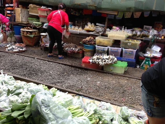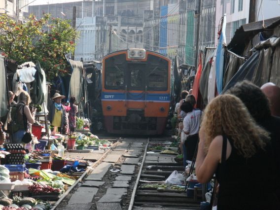 メークロン市場は、市場自体は観光化されていない為、物価が激安です。果物や食材を購入するんだったら、ここはお勧めです。電車が入ってくる時は、テレビで見たとおり、サァ~~っと撤収する様がとても良いです。一見の価値ありです。その瞬間の観覧スポットは、駅のとなりの踏み切り付近を指定されると思いますが、そこはかなり混みあいます。電車が来るまでの間に線路内にある休みの店を探してそこで待機、電車が入ってきた時はそこの店の壁に張り付いてみるのが迫力満点、かつ他人に邪魔されず見れるので良いかと思います(写真を参考にしてください)。ただし、絶対に壁に張り付いてください。それでもかなり電車との距離はスレスレです。