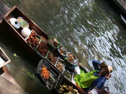 水上マーケットは、ボート移動の際の景色が良かったです。マーケット自体は観光化されてるので、一通り目を通す位で良いかと思います。あえてお土産をココで買う必要は無いと思います。食べ物は買っても良いかも。バナナのフライとか、春巻きみたいなのとか、30バーツ前後で売ってて、美味しいです。価格の交渉も無しなので、気軽に買えます