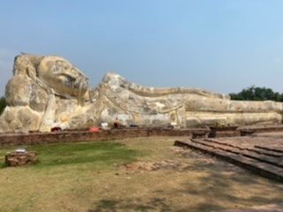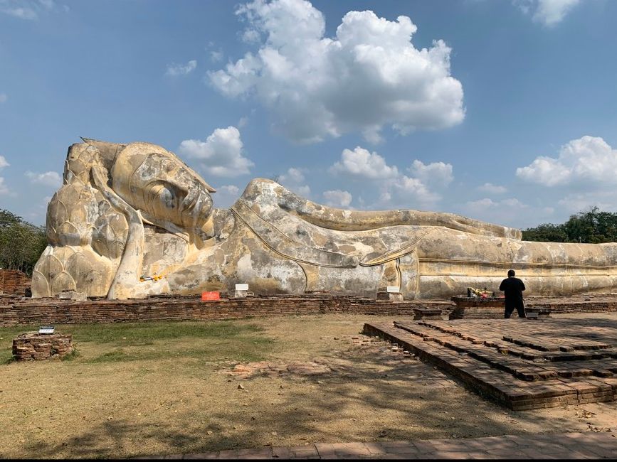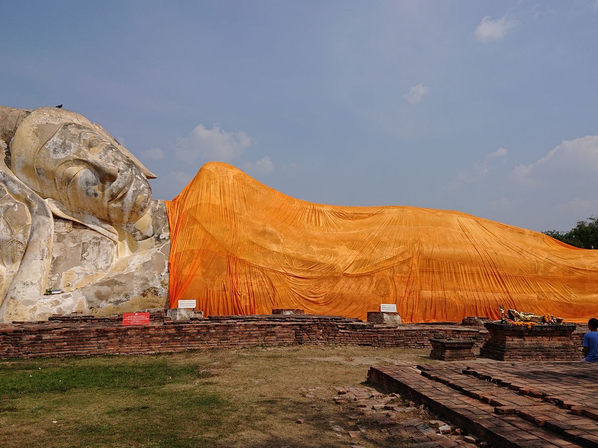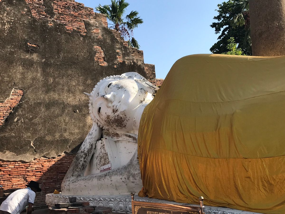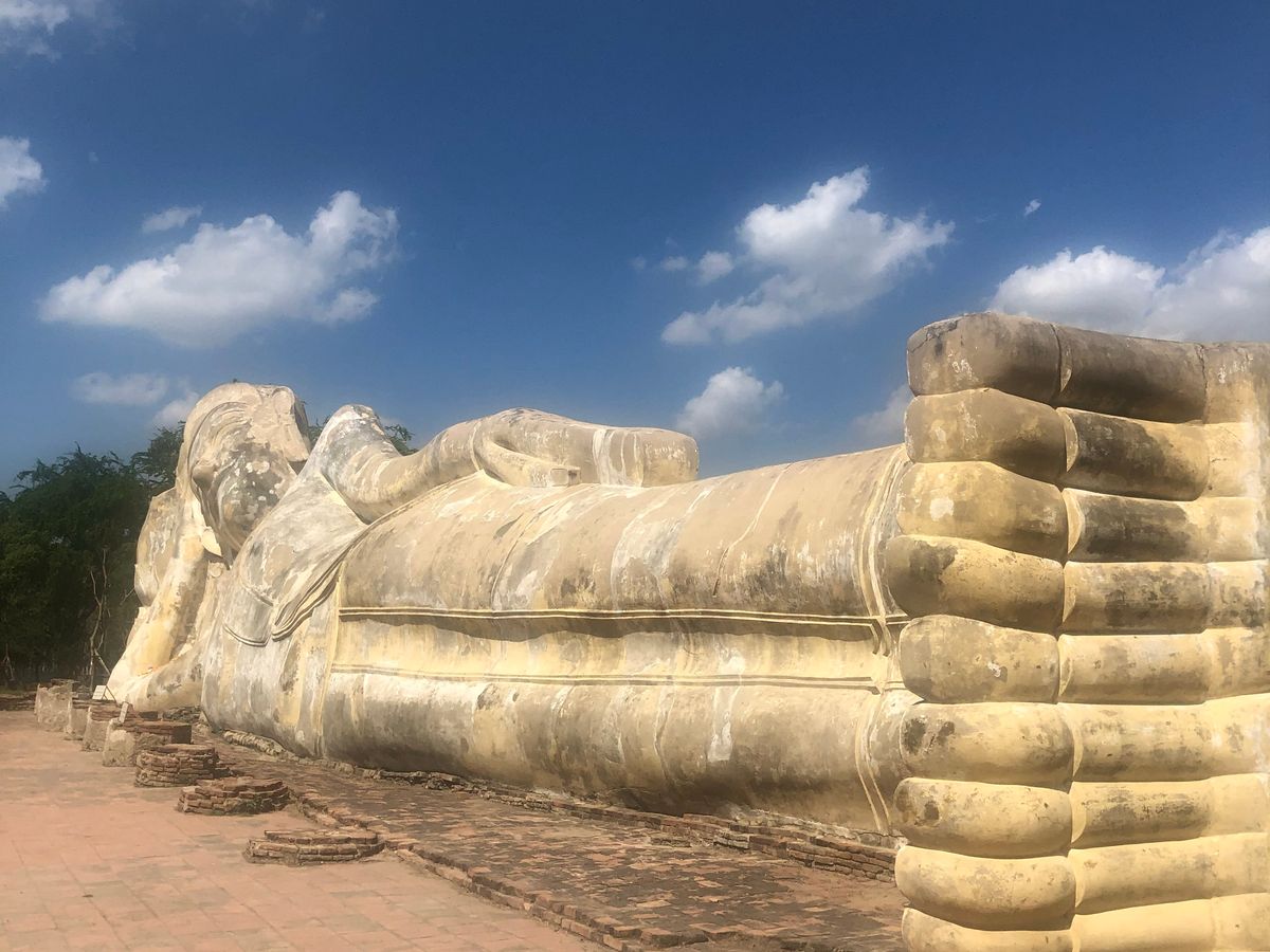 涅槃の真似をして地面に横になったり足を向けたり、遺跡の仏像跡に登る、触れるは罰当たりなのでタイに行く前にマナーとして弁えましょう。別のツアーの方が横になっていて笛を鳴らされ怒られておりました笑