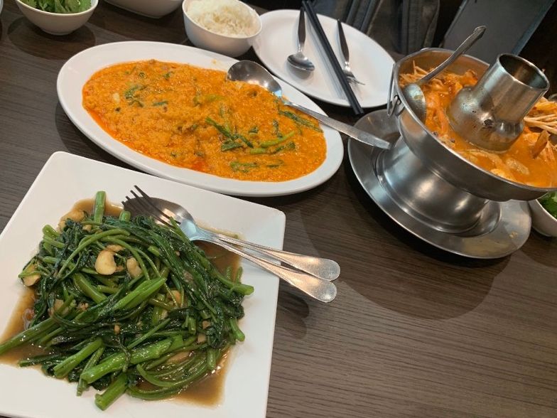 セットはプーパッポンカリー、トムヤムクン、空芯菜炒め、トートマンクン!