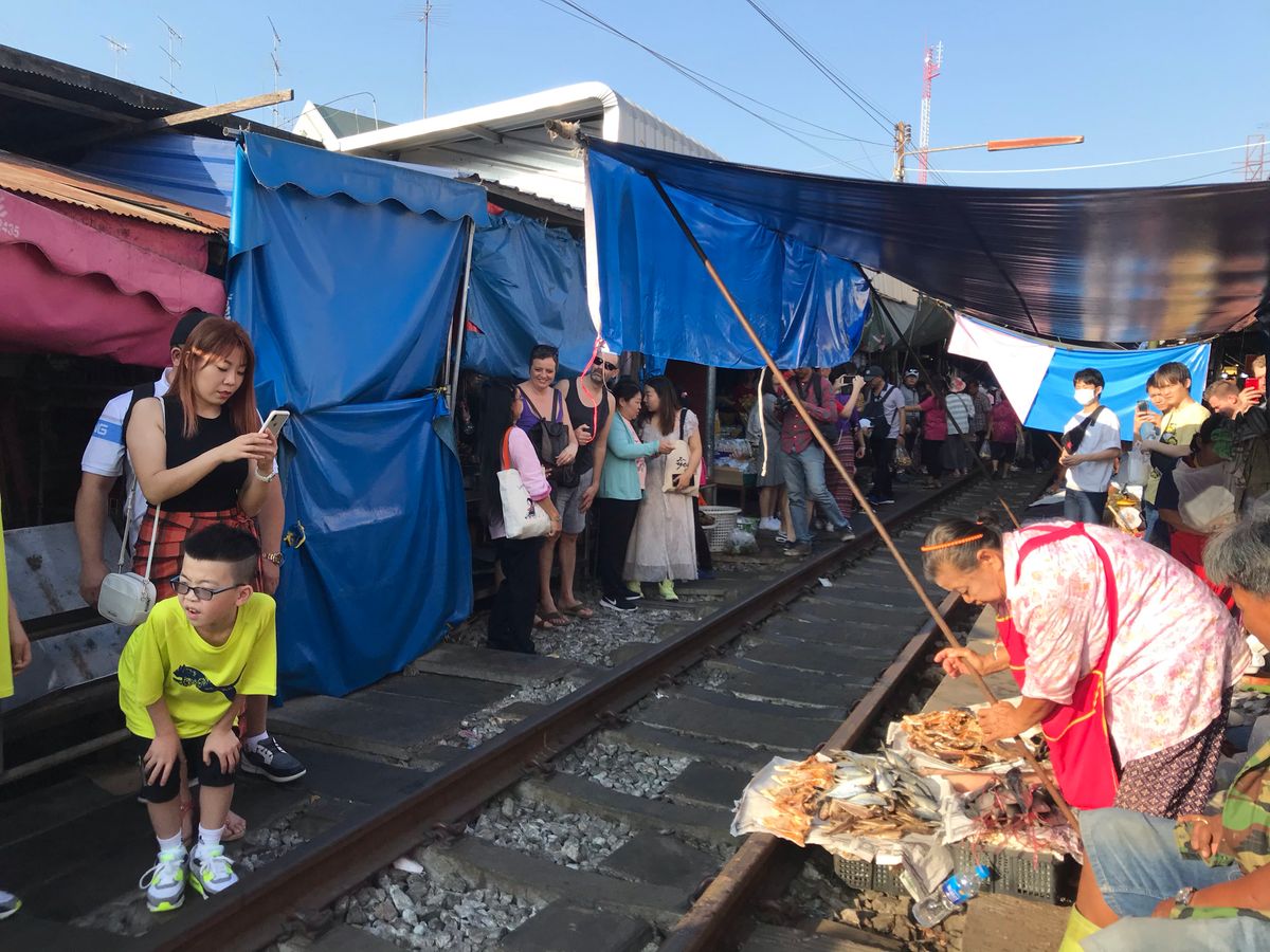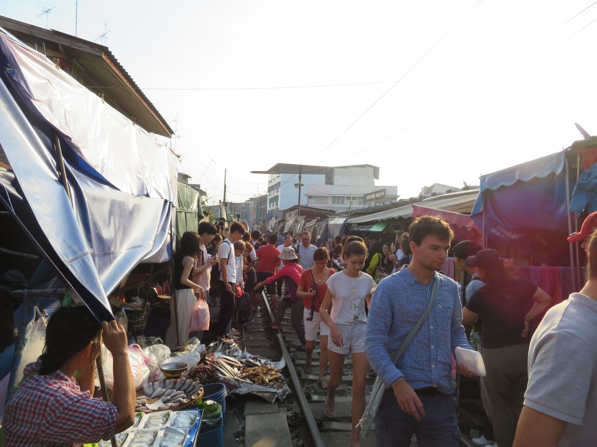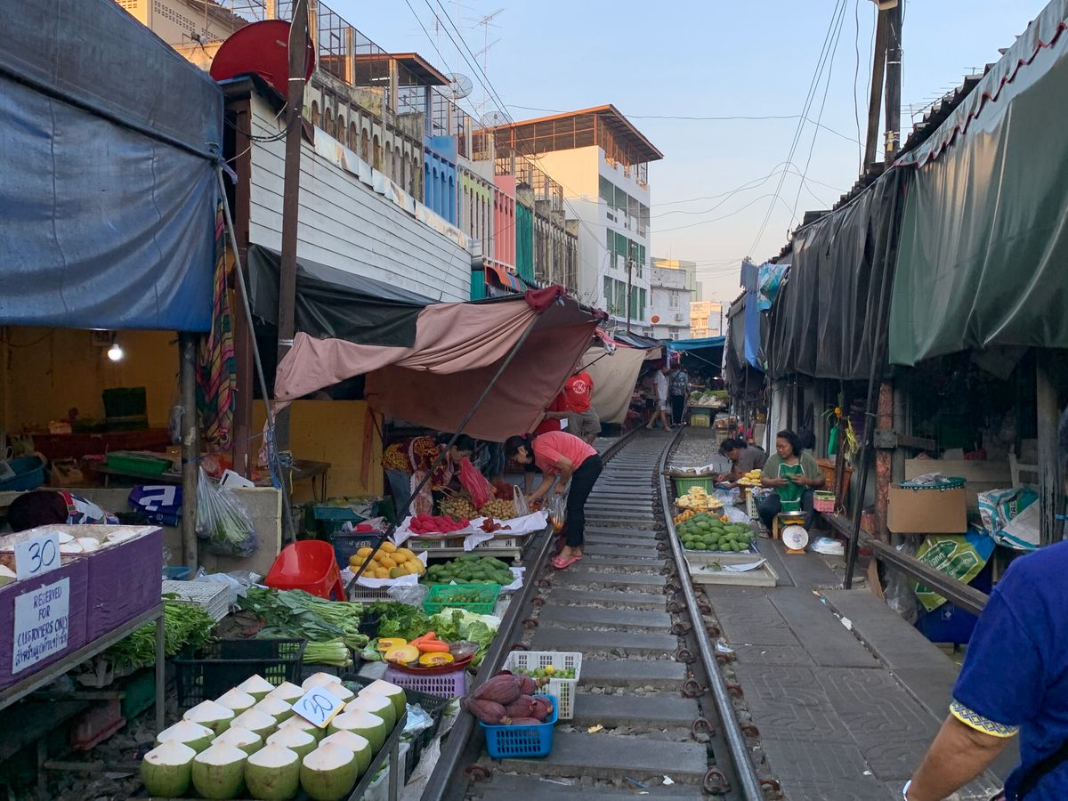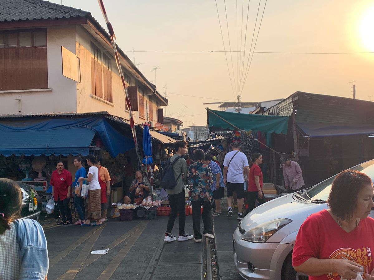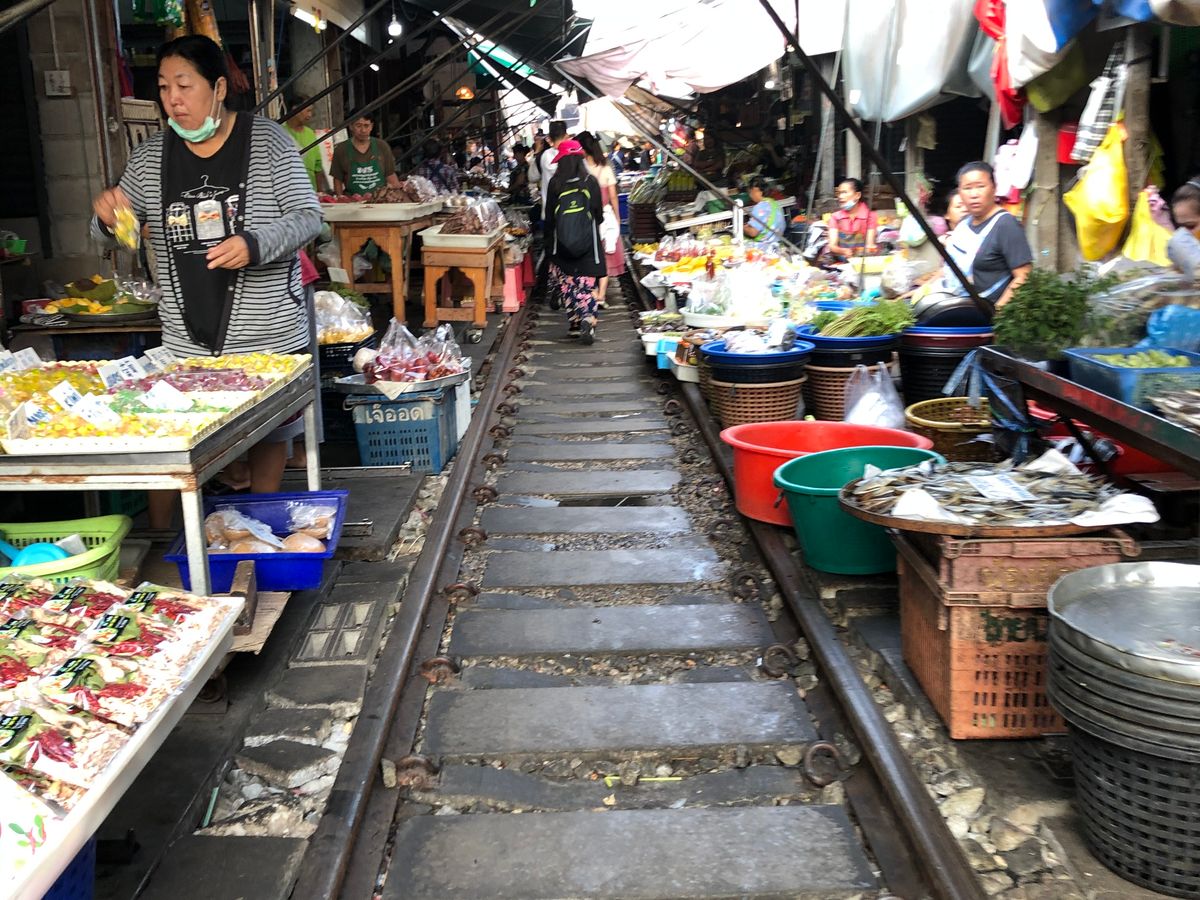 メークロンはとても混み合っていて活気があり、線路には出店がたくさん出ていて、電車が通るギリギリまで店を片付けて、電車が通りすぐに元の出店に戻る。一連の流れが当たり前のように行われていて、日本では絶対に見られない特別な雰囲気がとても楽しかったです。