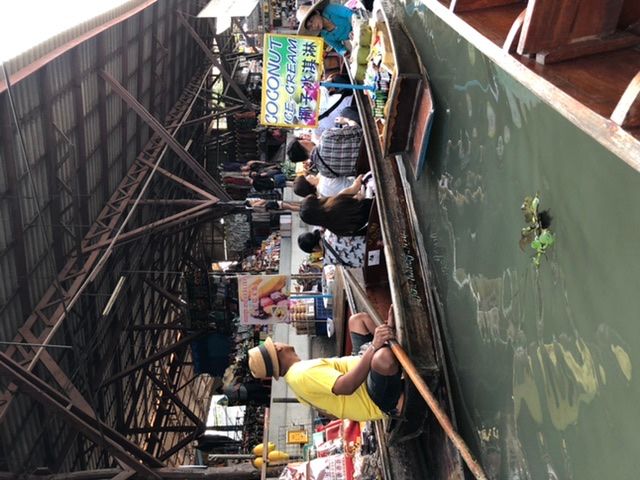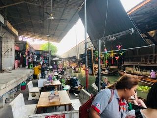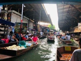 2020年一発目は、朝、6:40ホテル出発でした。先に水上マーケットとメクローン市場へ行きました。バンコク市内からちょっと距離がありましたが、思っていたよりも、テレビで見たよりも私は感動しました。やはり、自分の目で、肌で現地を感じるのはいいことだと思いました。電車が駅に接近してくるとき、線路上にまで並んでいる商品やテントを駅のアナウンスでみんなが一斉に片付け始めて・・・。電車が通過するときは本間、店や商品ともすれすれ。でも、みんな慣れたものっていう感じでした。焦らずに、通り過ぎたらまたテントを広げて・・・。
