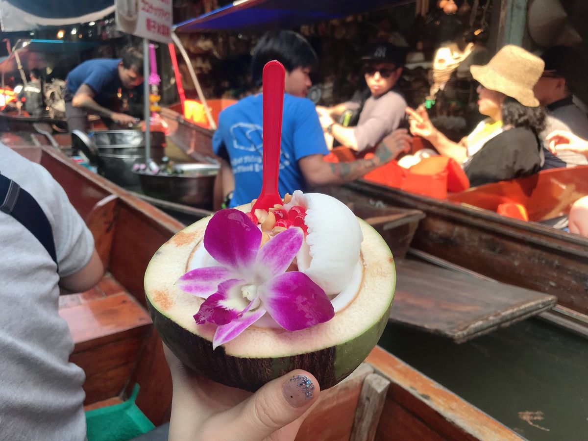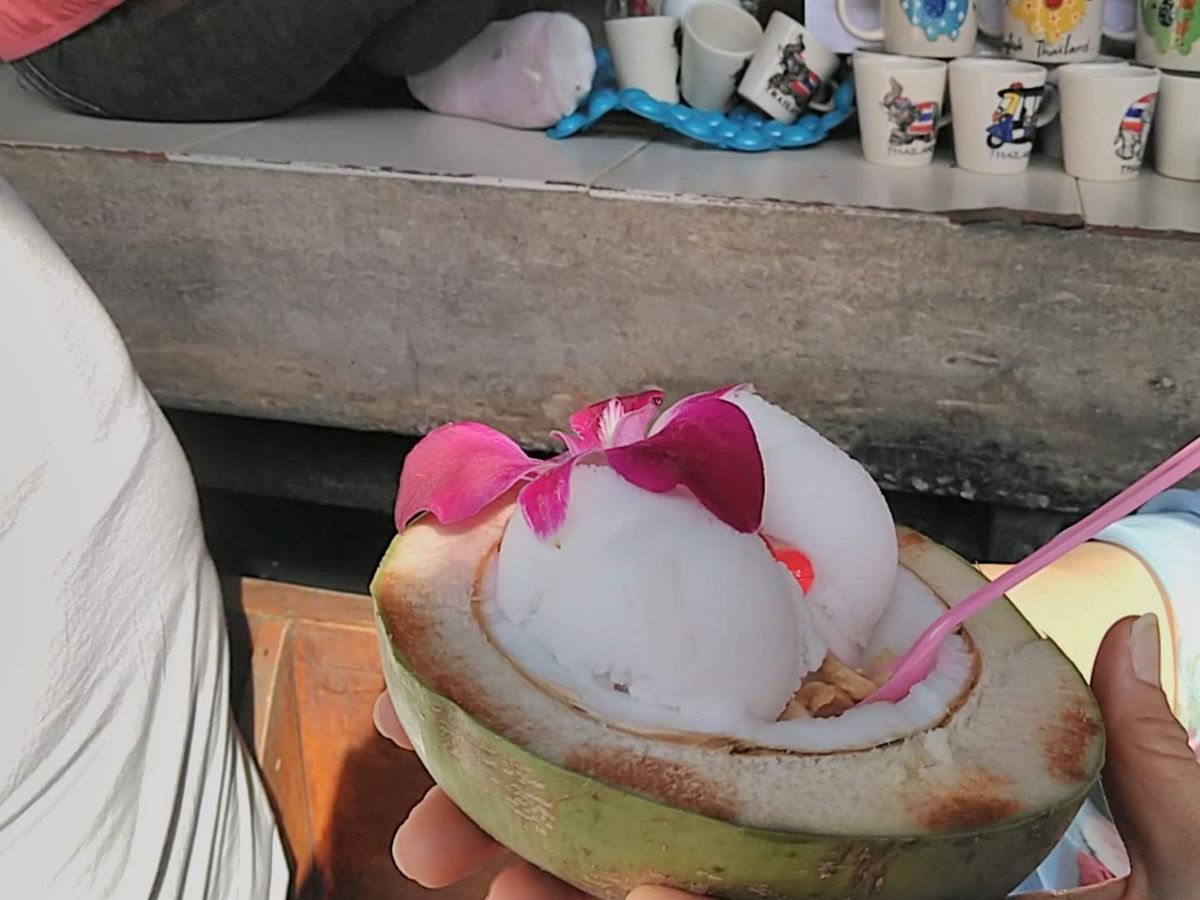 水上マーケットではココナッツの殻に入ったココナッツアイスクリームが甘すぎず濃厚ですごく美味しかったです。写真映えも◎