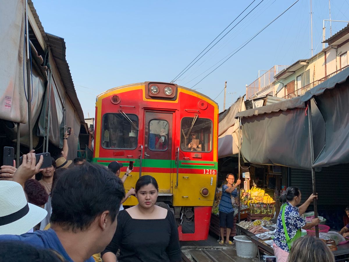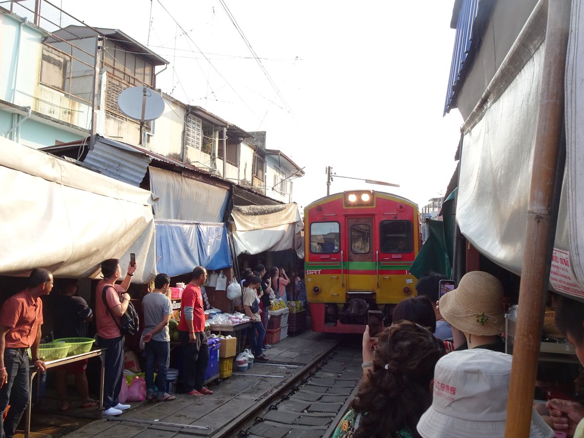 ・メークロン市場では列車に触る事ができるくらいゆっくり列車が通るので、列車に乗っている人に手を振るのが楽しい。