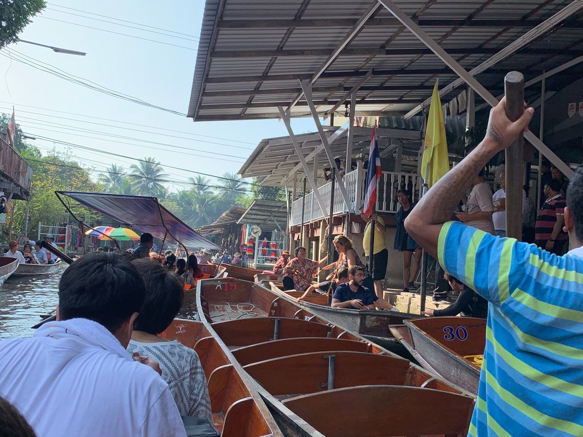 しかしながら、水上マーケットは想像よりも店が少なく、運河の周りに店があり、船上の店は少なく感じました。船上の食べ物屋も想像よりも少ないように感じました。また、運河を航行する船も秩序がなく、対向船がすれ違えぬほど渋滞してしまって、数メートル進むのに数十分を要し、途中で退屈になると同時に、次のスケジュールに間に合うのか気が気ではありませんでした。