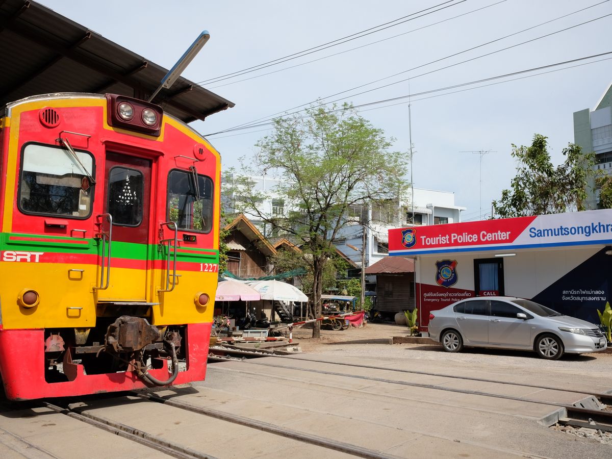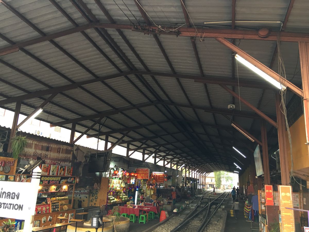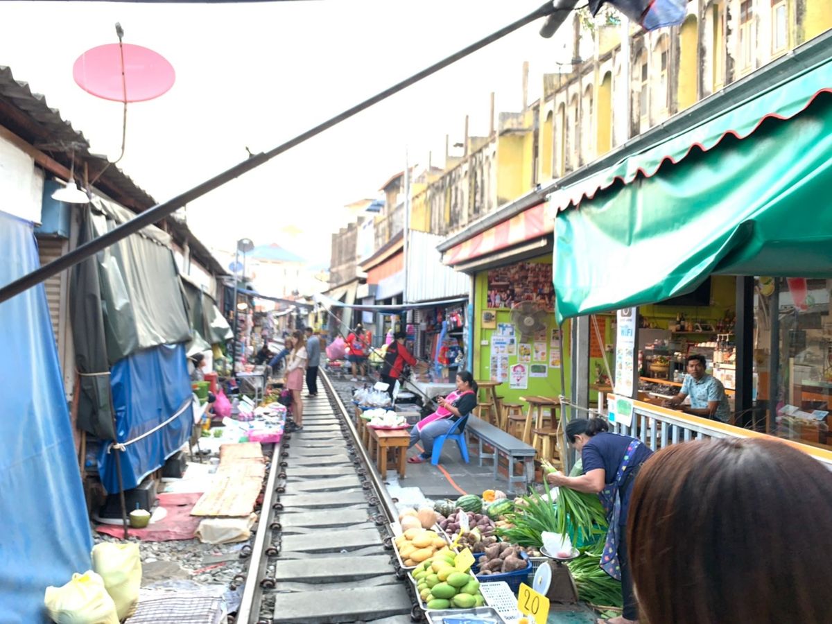 メークロン線路市場は混雑していますが、ちょっとした小物や香辛料、ドライフルーツなどが非常に安く売っているので、それらを購入したいのであればかなりお得に購入できます。線路上に商品を並べていて、電車が来る時間になると瞬時に商品を店の奥に片づけるということや電車が人や店のすぐ目の前(手で触れられそうな距離であり、野菜など轢かれいるものもあり)を通過する様子は日本では見ることができないので、驚きとスリルを感じることができました。ここでのトイレはお金(5バーツ)が掛かります。