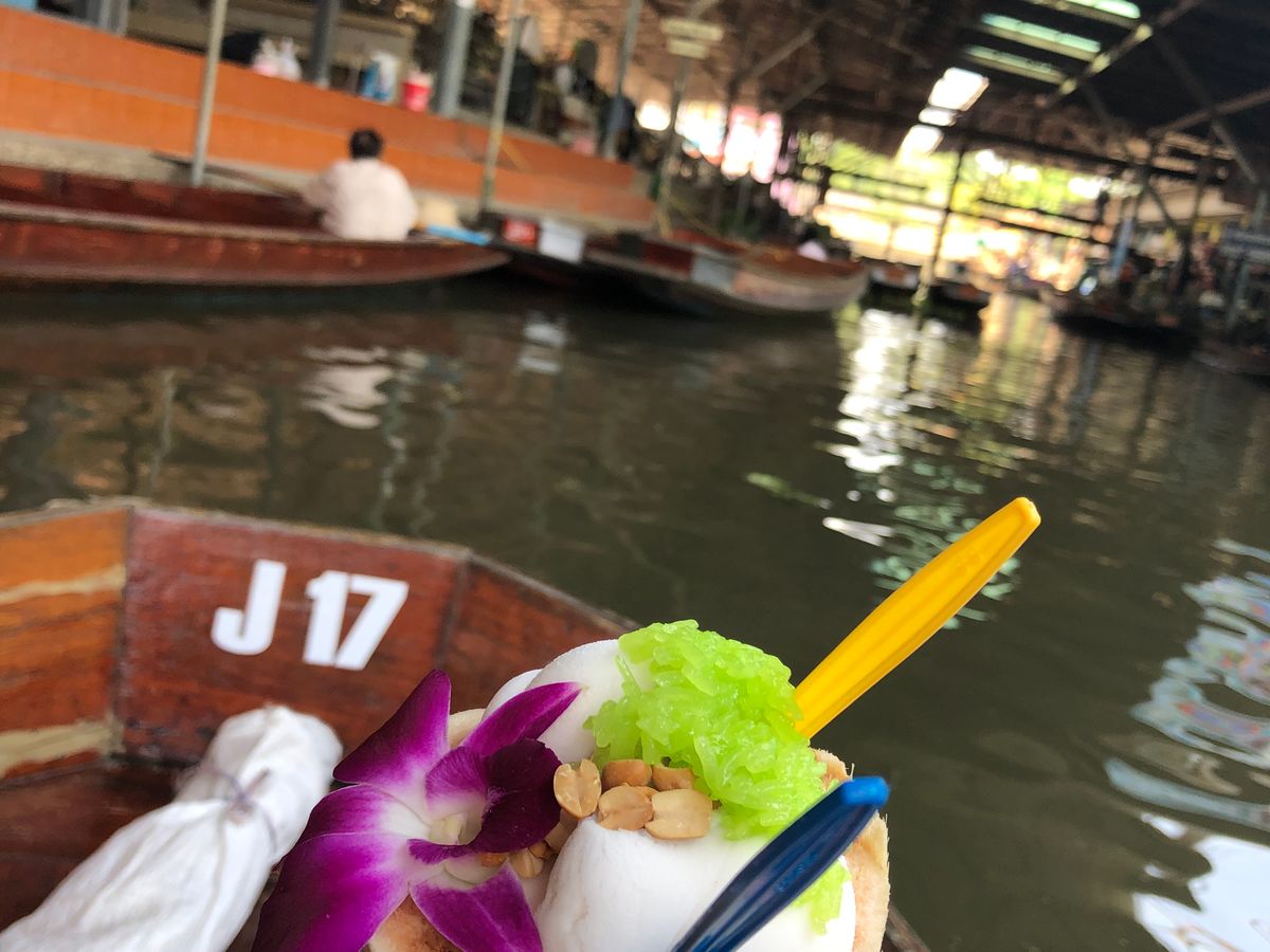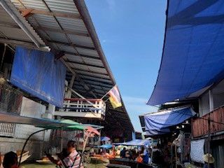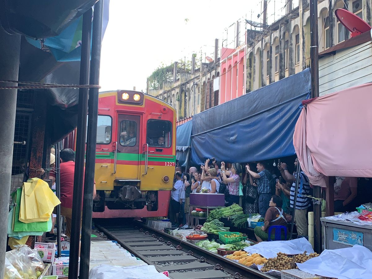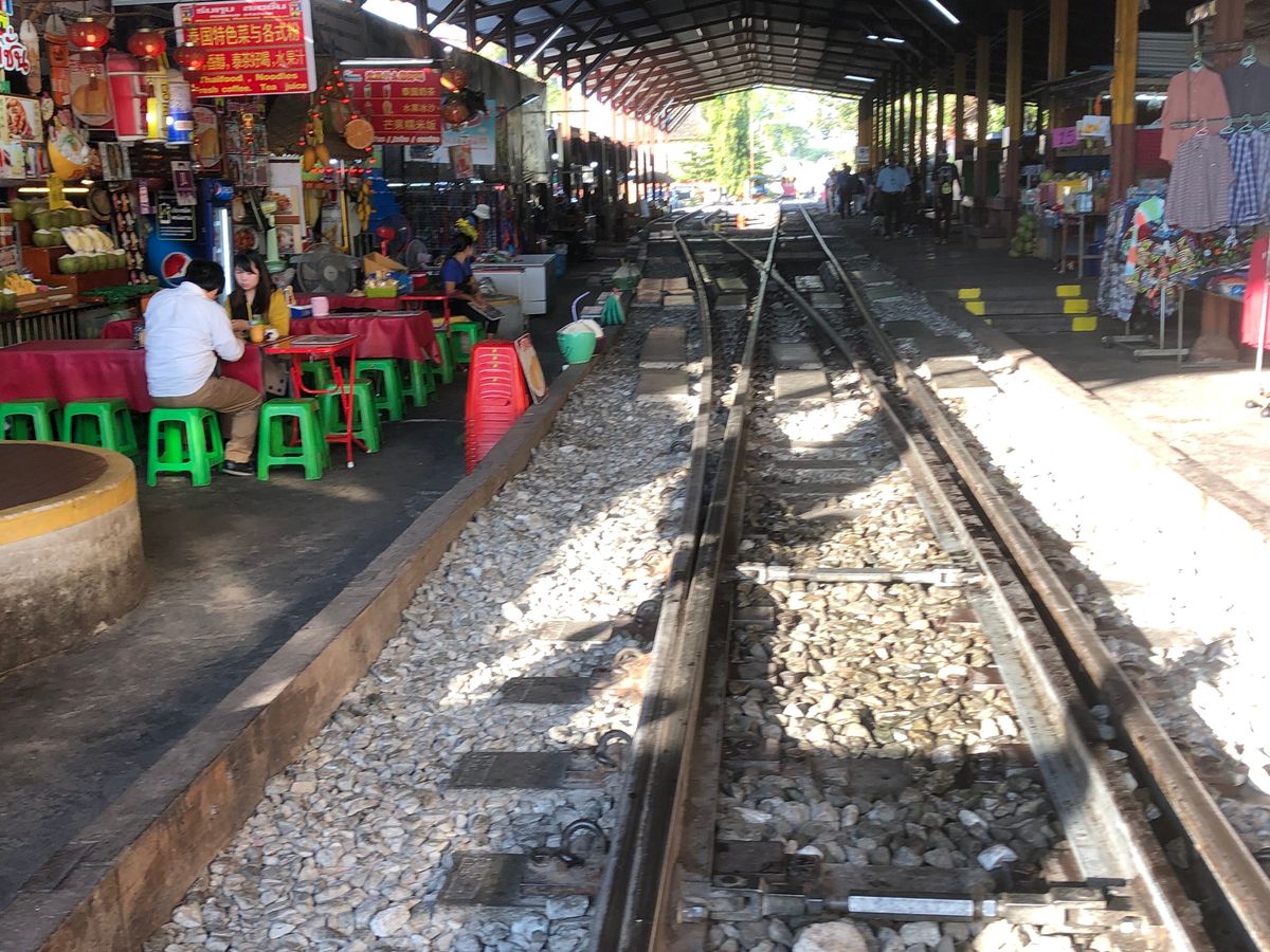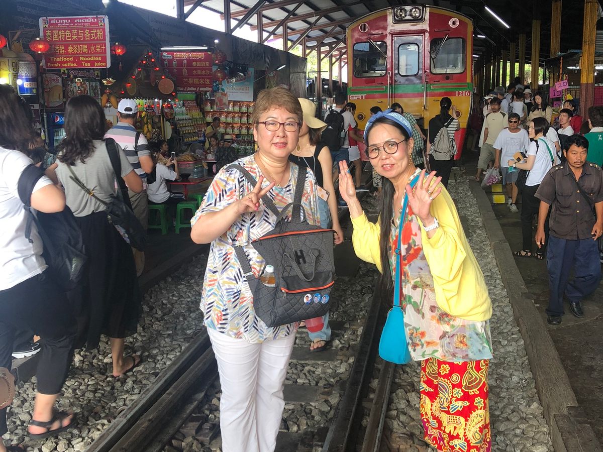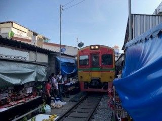 路線市場は期待していなかったが 日常食品材料など売っているその場所に気動車が通る姿は圧巻、面白かった。 多くの写真撮影観光客で混雑していてガイドにはぐれないように注意が必要。 バンコクへの帰り道、寄ったタイラーメン思ったより美味しく一番の思い出になった。この昼食にはアイスクリームが付いている。