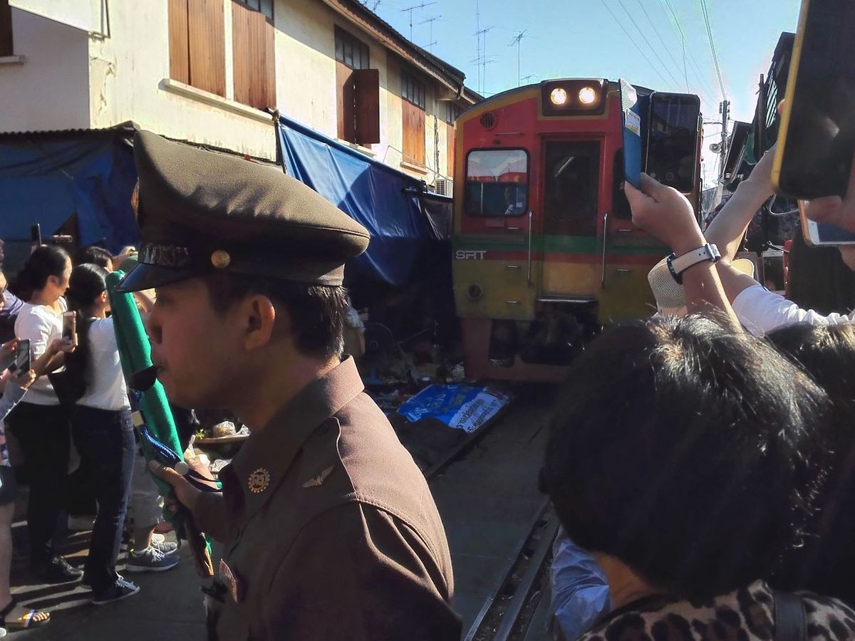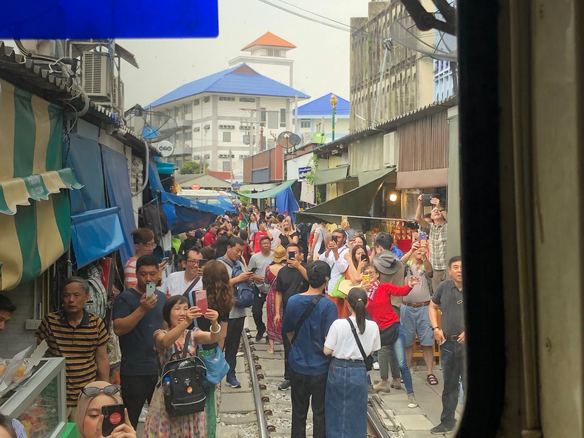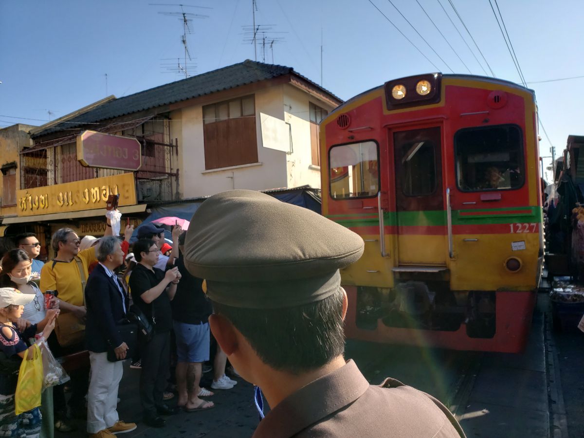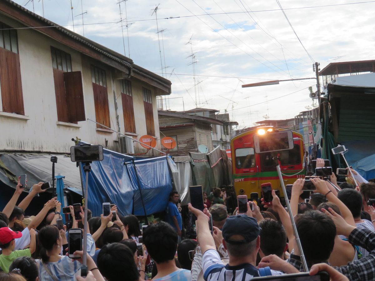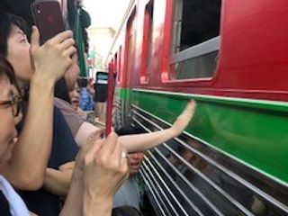 そのあと、メークロン駅の数駅手前で電車に乗り、メークロン駅に電車で到着というプランです。駅では、観光客が列車の到着を待っているので、窓から外を見ていると、大歓迎で迎えてくれます。スター気分です。