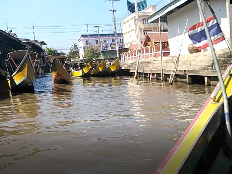 そして次は、水上マーケット。まずは手漕ぎの船に乗り、ゆったりと水上マーケットを堪能。これで終わりかと思うと、水上マーケットにつながる、ラーマ4世時代に作られた運河を、エンジン付きのボートで猛烈なスピードで疾走。