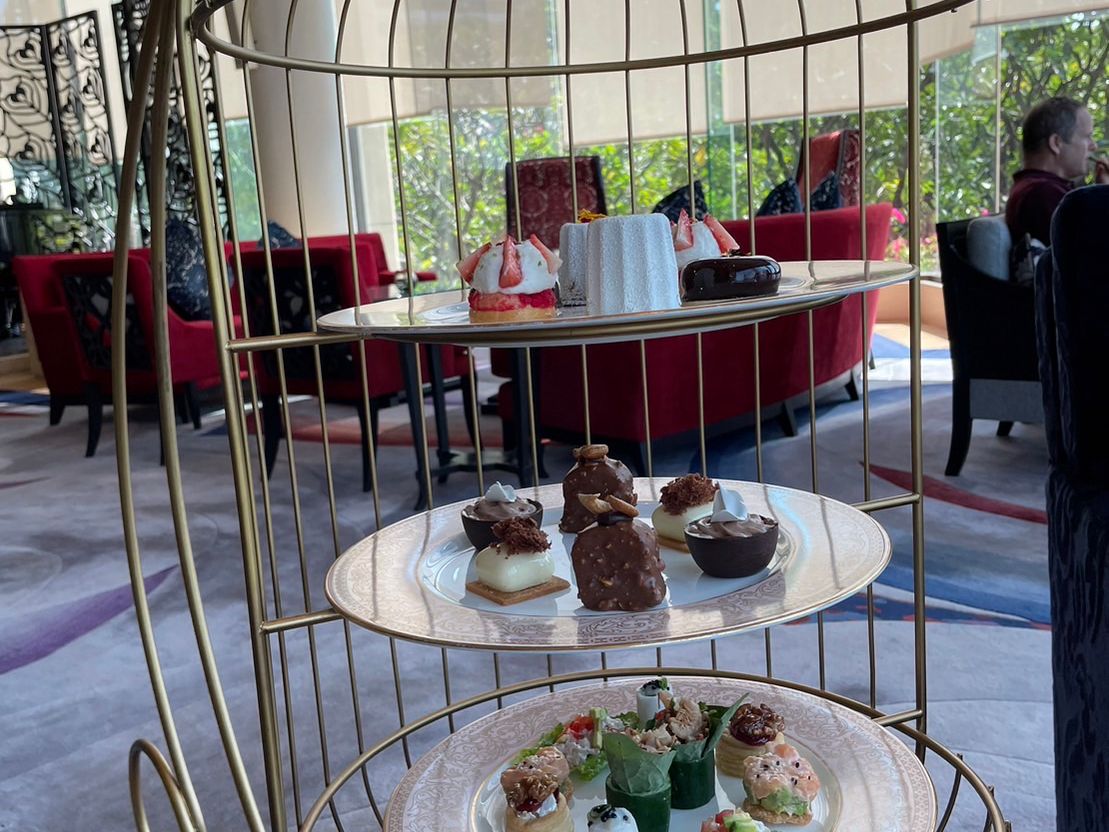 ホテルに入るとすぐにドアマンの方から声をかけられ、「アフタヌーンティー」と伝えるとラウンジまでの行き方を案内していただけました。少し早く到着してしまい、英語で何と伝えよう、と考えていたら、すぐに席を案内され、接客も親切でした。スイーツもセイボリーもバランスがよく、ありがちな甘ったるさもあまりなく、おいしく完食。眺めの良い席で雰囲気も落ち着いており、とても優雅な時間を過ごすことができました。