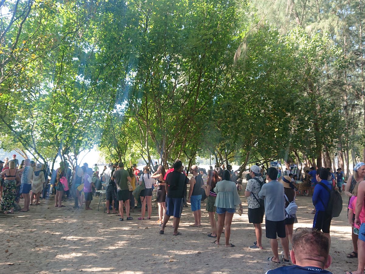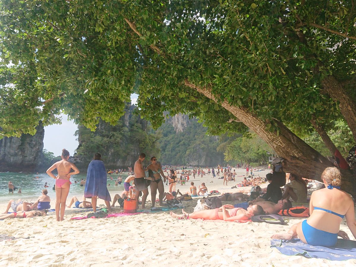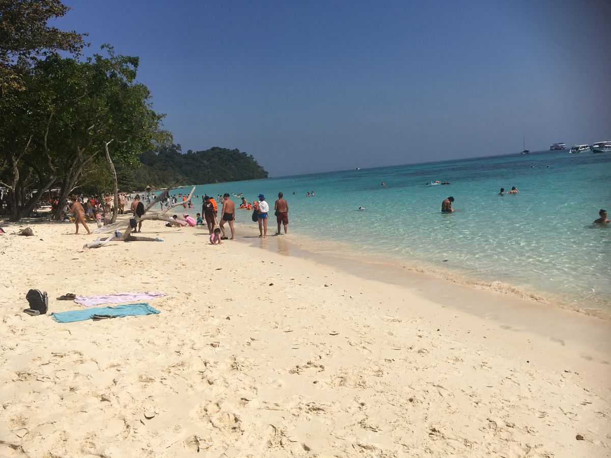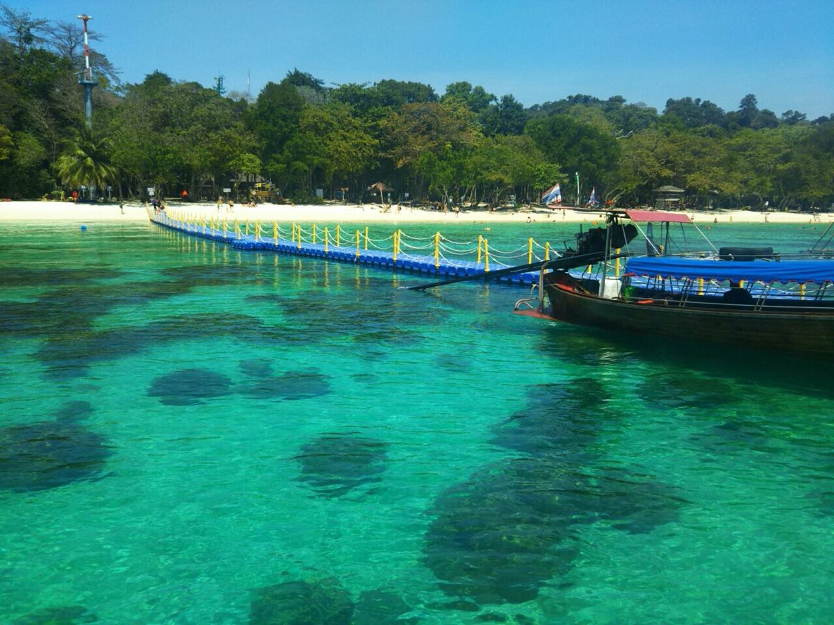 乗船場所は、クラビからとんでもなく遠方の乗船場所で、下船場所は、乗船場所に船が着けられないため、海の上で下ろされ、30㎝ほどの遠浅の海を300m近く歩いて、ビ-チに上がりました。
