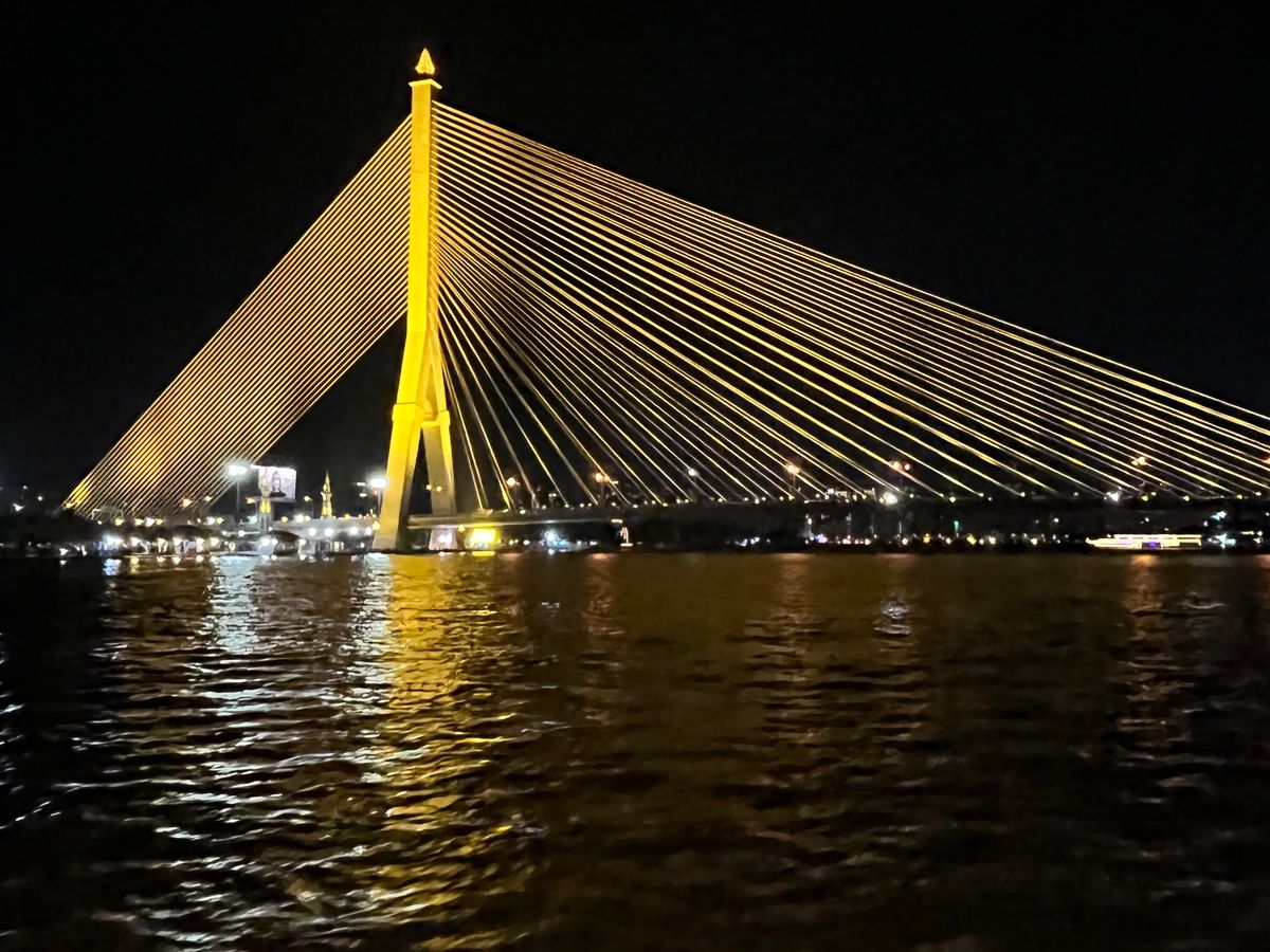 ・プランのスケジュール欄に「船がラマ8世橋を折り返す頃には、ダンスパーティー会場のようにライブも盛り上がります。」とありました。ラマ8世橋まで行くのであれば当然ながらワットポーやワットアルンなども見れるだろうと期待をしていましたが、、、実際にはそれよりもはるか手前のプラポックラオ橋にも行かないくらいで折り返しました。そこから出発したアジアティーク方面に戻り、逆サイドのラマ9世橋の方までいく感じでした。しっかりと情報を記載してもらわないと、わたしのように寺院ライトアップを見れると思っていた人はがっかりすることになると思います。