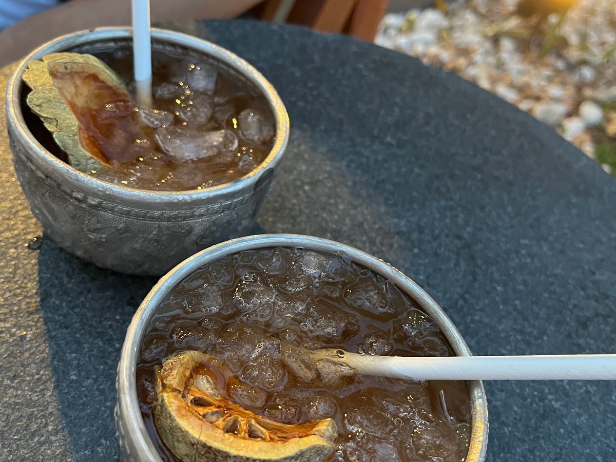 コロナのため、サトンピアからホテルまでの船が1時間に1本になり、集合時刻の1時間前にホテルに到着したため、リバーサイドのバーでカクテルを飲んで待っていました。