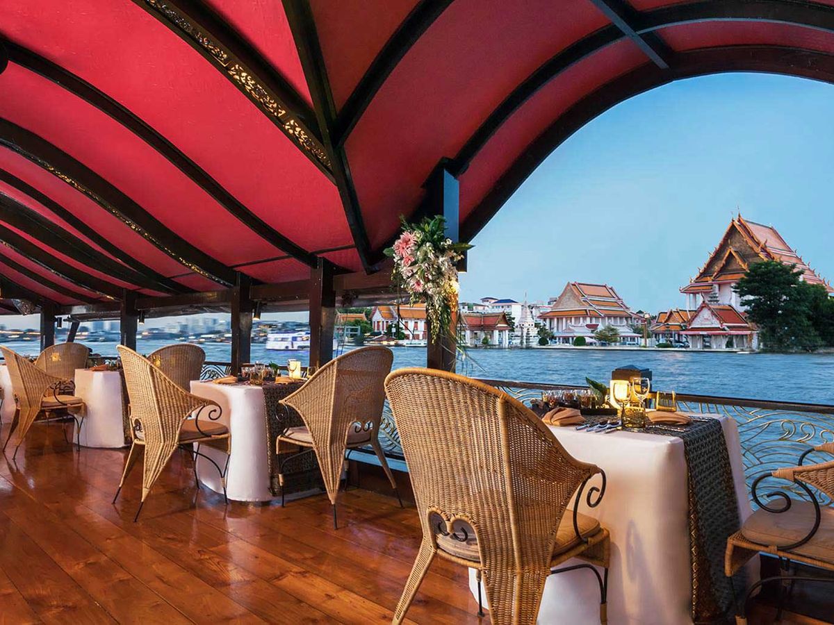 5年前にリバーサイドのホテルに宿泊した際に目の前のチャオプラヤ川を行きかうクルーズ船を見ながら、次は絶対に乗ろうと決めていました。大音量で音楽を流しながらビュッフェスタイルで盛り上がるクルーズも楽しそうですが、コロナ禍の今はテーブル席でゆったり座ってコース料理を楽しむクルーズの方に魅力を感じました。