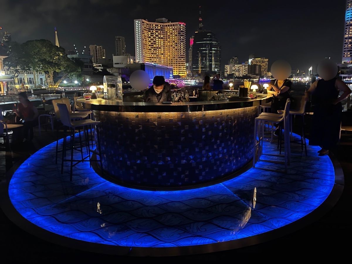 デッキのバーカウンターは夜の雰囲気に合ってて素敵でした川辺の寺院などのライトアップを見ながらゆったりと過ごすの最高に良かった