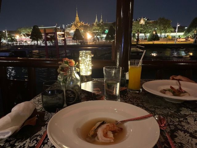ICONSIAMの目の前の埠頭から乗船。川から眺めるバンコクの夜景は最高です。乗務員の方々も親切で、写真をたくさん撮って下さいました。ダイニングルームに移動し、ダイナーが始まったあたりから、大雨が!でも、雨越しにライトアップされたワットアルンや、王宮は素敵でした。