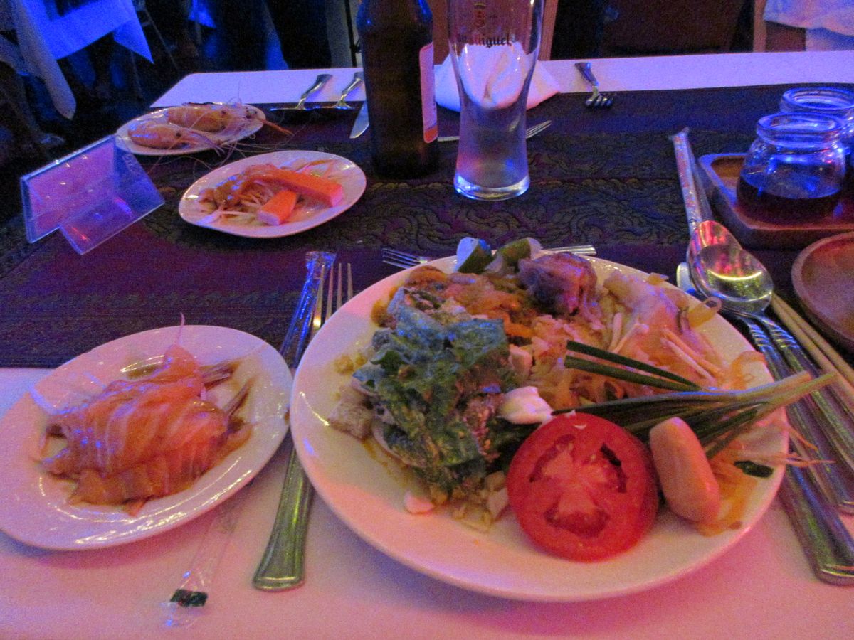 タイの船上でお刺身、ちょっと不安でしたが、これがどうして、よく冷えていてサーモンは超美味でした。