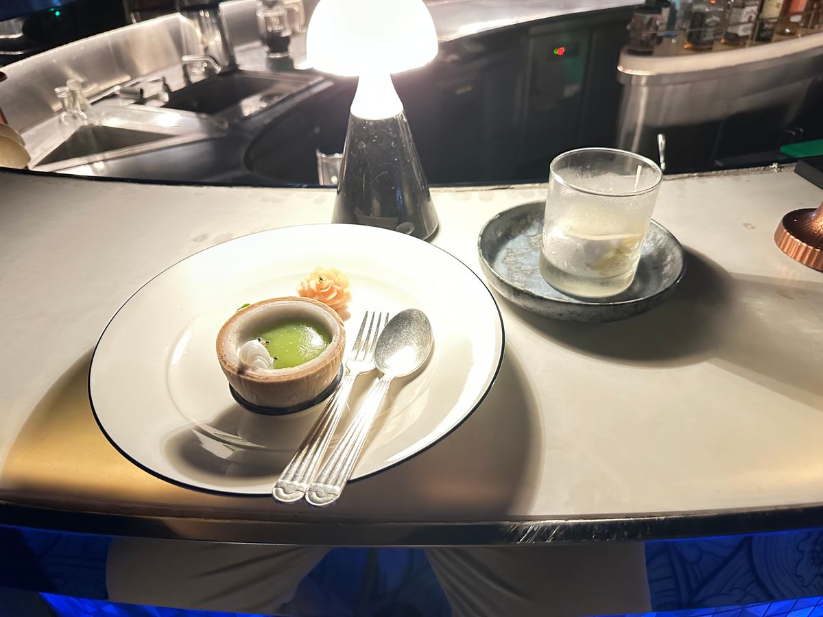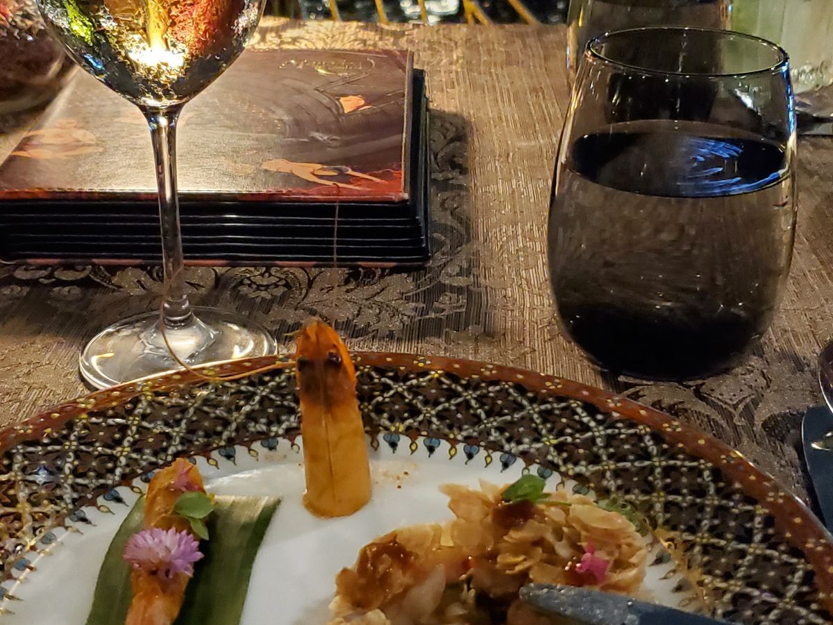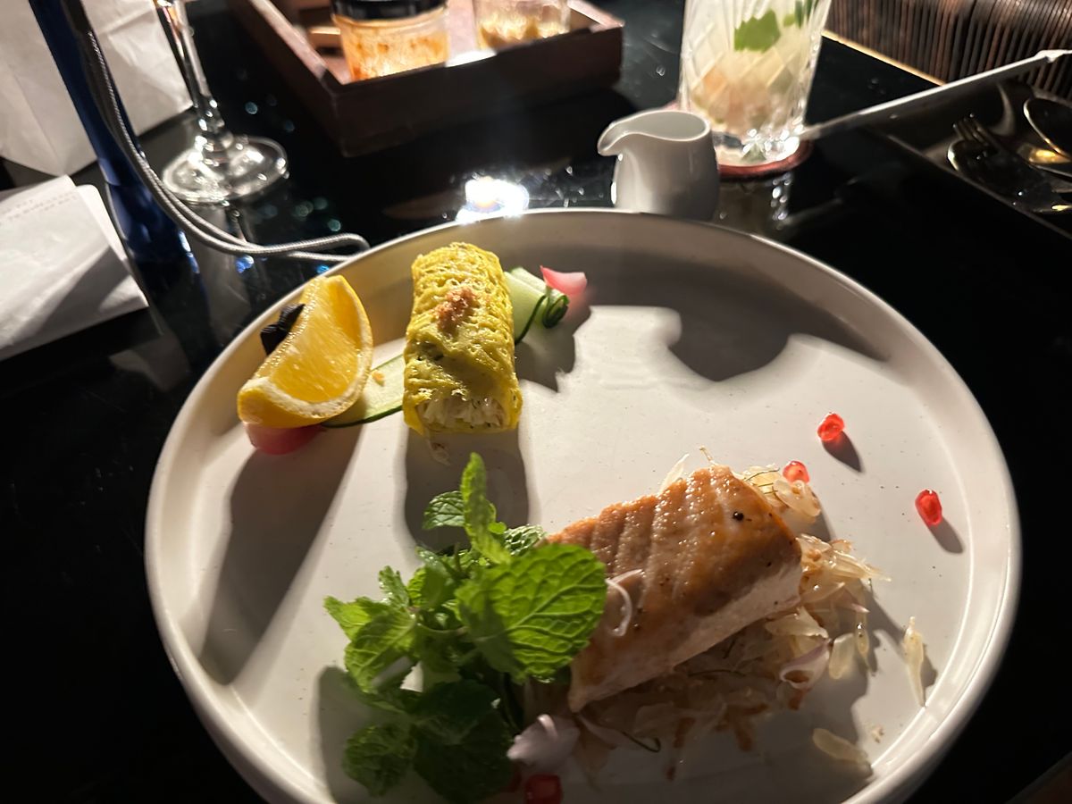 乗船前に桟橋でタパスのサービスがあり、気分が盛り上がったところで、いざ船へ。川側の中央席に案内され、飲み物、おしゃれなタイ創作料理が次々と。チャオプラヤー川の夜景も素晴らしく、気分を盛り上げてくれます。
