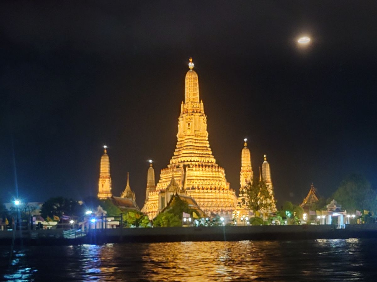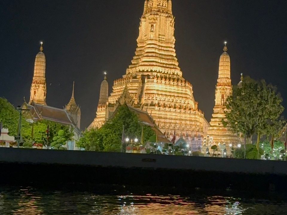 ワットアルンの夜景は向かいのレストランから見るよりずっと近く想像以上に素敵で、コースで出るタイ料理も美味しかったです。船もあまり揺れず航行中は風が涼しくて快適でした。ただ、出航を待つ間のテラスが暑くて蚊に刺されて痒かったのが残念でした。