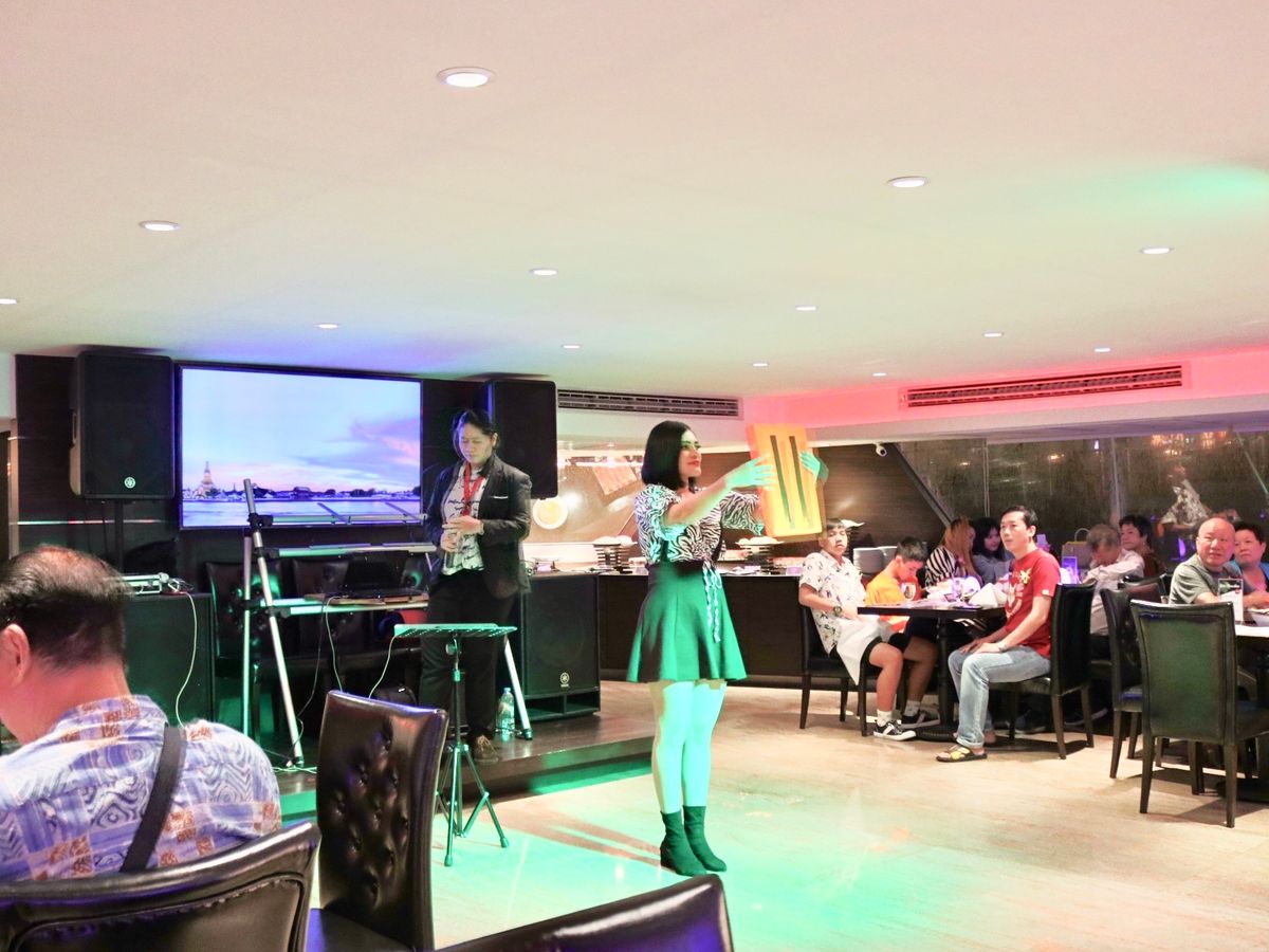 乗船すると座席に案内され、ウェルカムドリンク付きのタイ料理のビュッフェを頂きました。とても美味しかったです。特にトムヤムクンスープは抜群に美味。船内では女性シンガーが2時間歌い続け、盛り上げていました。