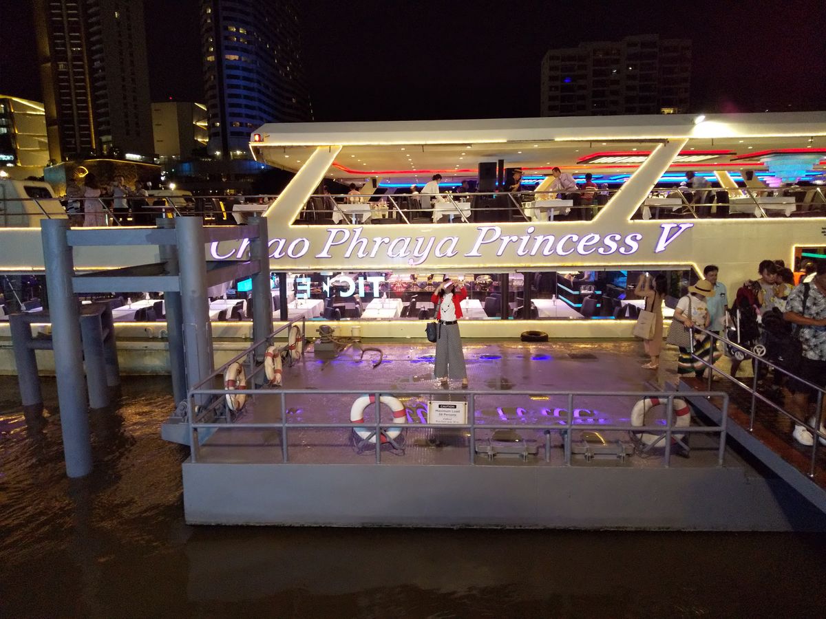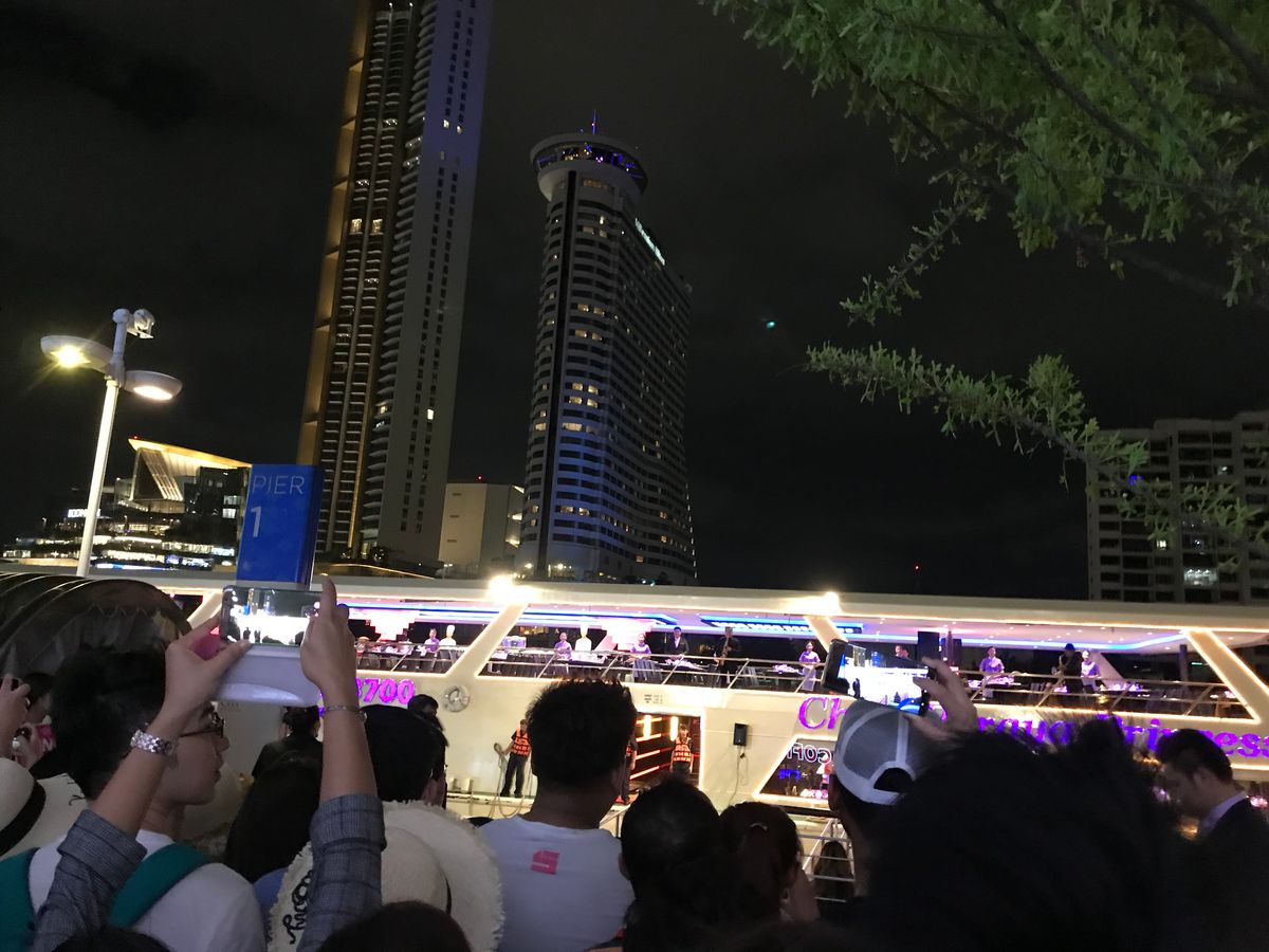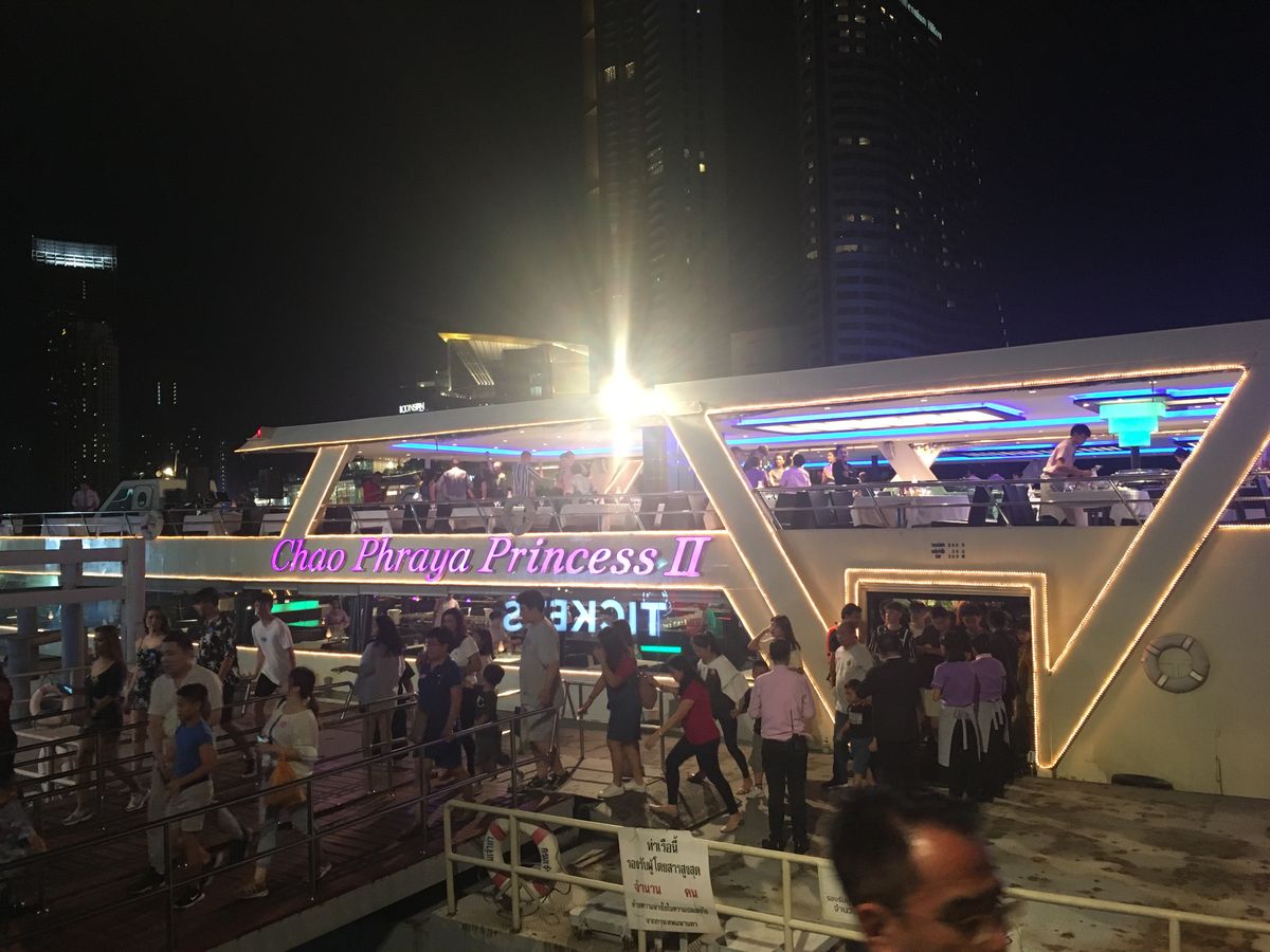 9/13-16初バンコクに行ってきました。9/13は15時過ぎに空港到着のため、19時からのディナークルーズに申し込みました。リバーシティはどういう経路で行くべきか迷ってましたが、徒歩10分圏内ということもあり、フアランポーン から歩いて行きました。が、途中で道に迷い到着したのは19時15分。あわや遅刻。乗船できて本当に良かった。船着場は他の時間のクルーズ客もいてごった返し。