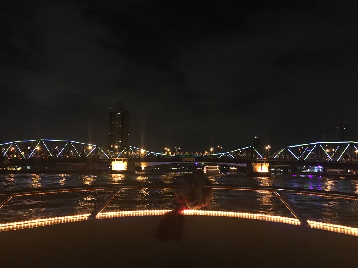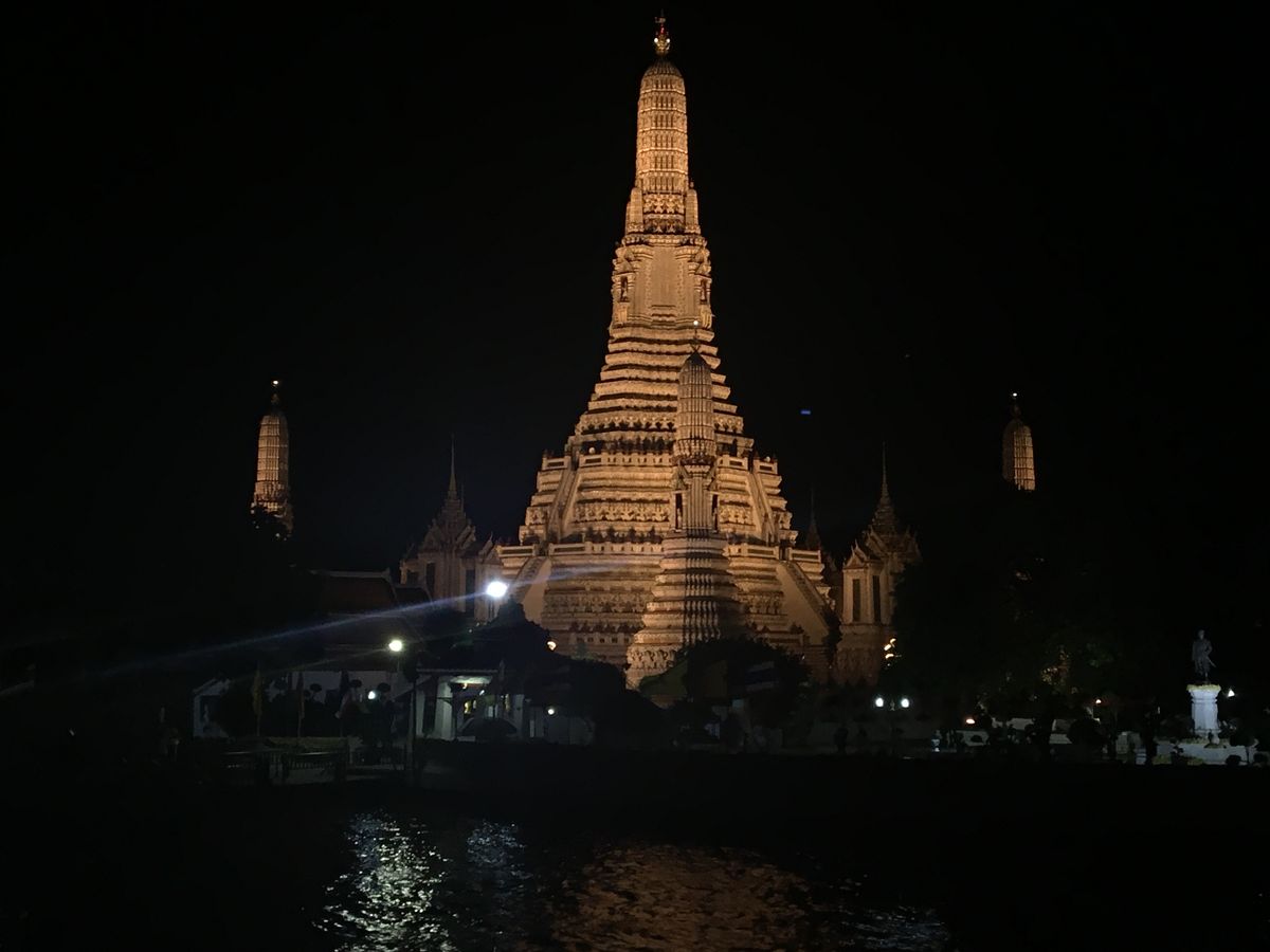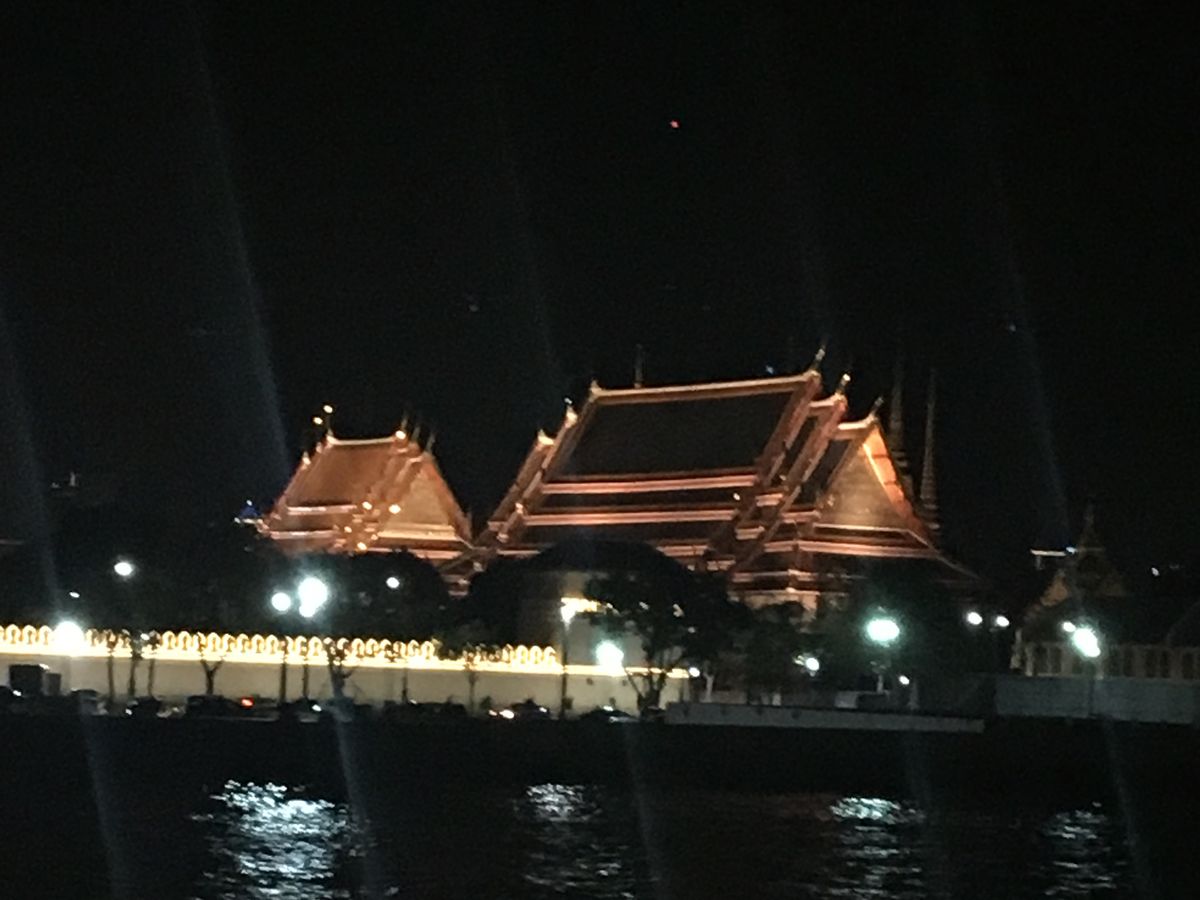 船上から眺める電飾されたワットアルン、ワットポー、ワットプラケオがとても綺麗でした、昼間ワット群に行けなかったので、丁度良かったです。バンコクのお寺巡りがこれで完了!