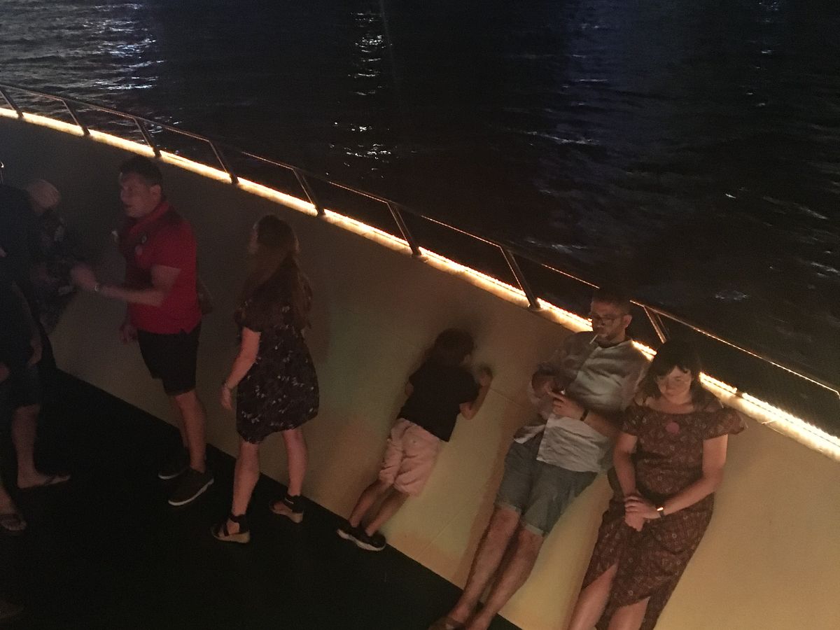 出航するとすぐ歌手が歌い始めましたが、最初は静かめの曲を、中盤からだんだん盛り上がってパワフルでラテンな感じの曲になり、踊りだす人もちらほら現れ陽気にさせてくれました。海外ならこれくらいにぎやかなほうが楽しいです。デッキに上がれば、ロマンチックにステキな夜景も楽しめます。