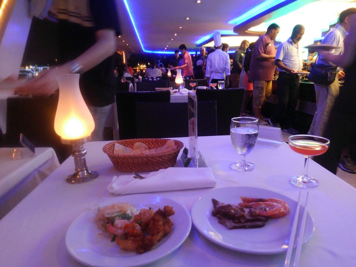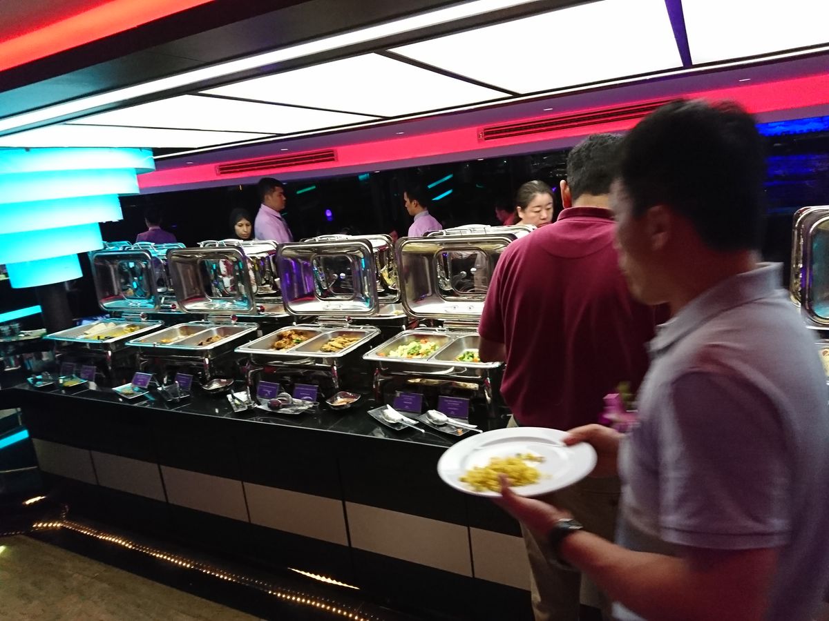 船に乗り込む時はUptown Funkの生演奏で迎えてくれました、席は全て指定されておりウェルカムドリンクが用意されてますビールや他のドリンクは有料で別途お金をはらいます、 料理の量は申し分無し、無くなっても直ぐに補充されてました、最初は人だかりが凄いのでゆっくり取りに行くのがベスト、個人的にはエビのボイルが美味しかった、ローストビーフは固かったです