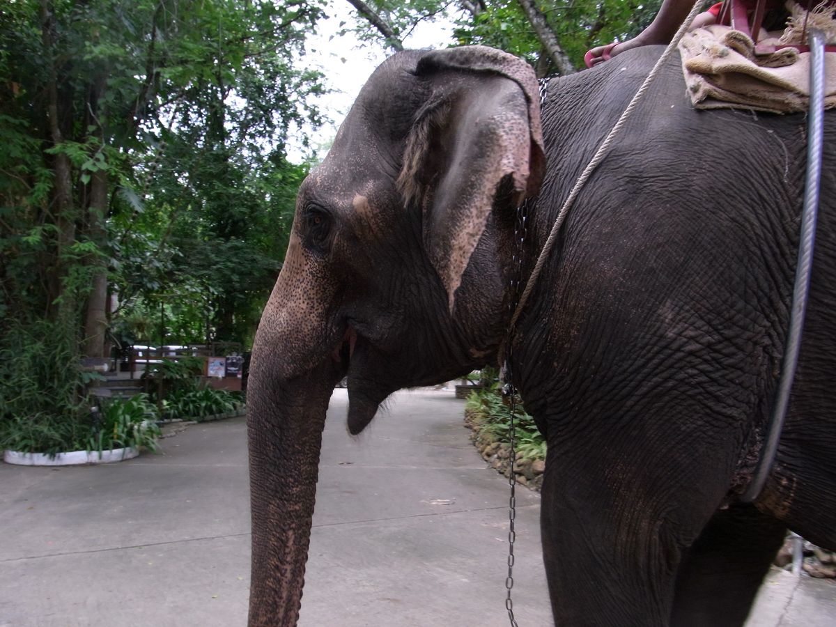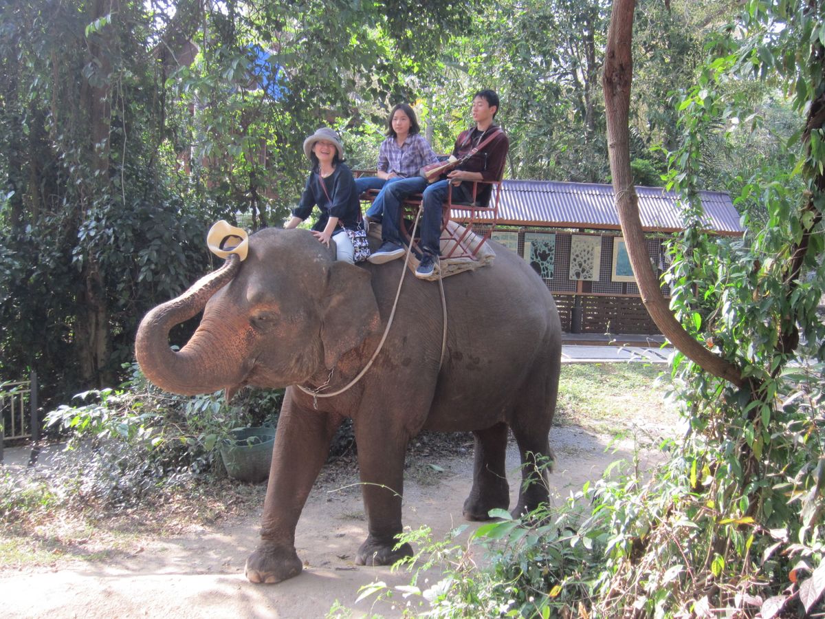 メインの像乗りはエキサイティングです。最初は椅子に乗って、その後象の上で椅子から頭(首?)の上に移動して直乗りしました。高いのが苦手な人はちょっと怖いかもしれませんが、象は大人しくしていてくれます。アユタヤでも象に乗りましたが、直乗りは全然違います!象使いさんが気前よく写真をパチパチとってくれました。