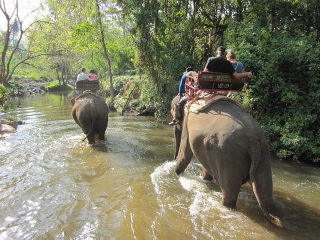 途中からは、象使いのおじさんは川岸に降り 娘が象の頭の上に乗り川をあるいていきました。象使いのおじさんは声で象を操りながらたくさんの写真をとってくれました。写真を見ると、象の目、ぎりぎりの所まで水に浸かっていました。乗り終わった後は象にバナナをあげ、たっぷり触り動物好きにはたまりませんでした。