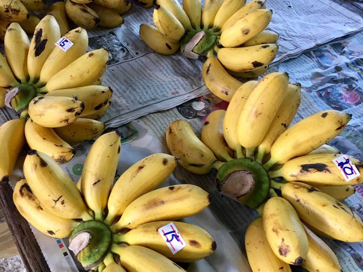 大人の親指位の大きさのバナナひと房が10THB(約34円)で売られていました。