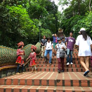 チェンマイ滞在が1日のみだったので、効率よく観光が出来るようにとこのツアーを利用しました。「ドイ・ステープ寺院に登らずして、チェンマイに来たと言うべからず」と言われるほど有名なドイ・ステープ寺院が1番の目的でしたが、300段以上ある階段は辛いとも聞いていたので、ケーブルカーに乗る気マンマンでいました。しかし案内も無く、ガイドさんを先頭にスタスタと行かれてしまったため諦めて登りましたがキツかったです。また境内の中に入るには靴を脱ぐのですが、屋根の無いところを裸足でというのはちょっと複雑でした。出た後、足の裏を拭く濡れたタオルなどを持ってくれば良かったと後悔しました。最後のお土産屋さん巡りは、やはり仕方が無いですかね。とは言え、個人で行くより効率よく見て回れたので、良かったと思います。