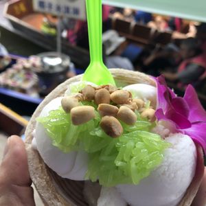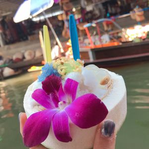 水上マーケットでの買い物は凄く新鮮で楽しい経験でした。手漕ぎボートに乗ってココナッツアイスや、豚の串焼きを買って食べながら、船上で買い物も体験出来ました。舟が通り過ぎるのが早いので値段交渉は一瞬で。