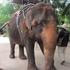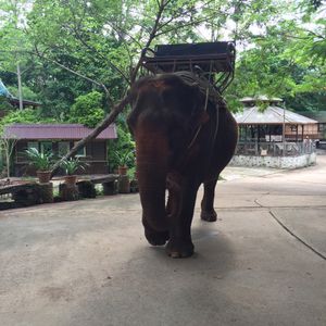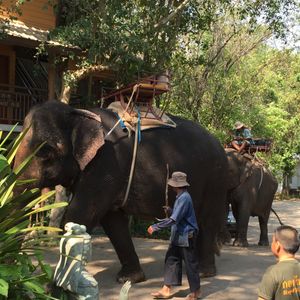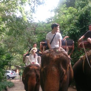 ここからですね…さてメインのカオヤイに!!前の体験談の方と同じで、この時期水が少ないので滝にはいかず別の所に案内するというのは、朝乗車してすぐガイドのメイさんから説明があったけど、結局どこにもいかず。熱帯雨林の散策もありませんでした。 2時間ちょいの移動、みんなだいたい車中で熟睡、起きたら、いきなり象乗り場についてて、乗りますよ〜って感じ。寝起きのまんま乗るみたいな。しかもうちは家族四人での参加でしたが、象の数が4頭のため、2人ずつ乗るのはできなくて、ぎゅーぎゅーで乗せられ。象に乗る時間などは他のツアーよりは確かに長いけど、いくら水がないからといっても、あれは水たまり?それよりもなし?って感じで、スリル等は全くなしでした。