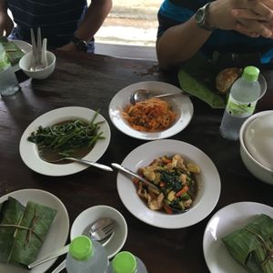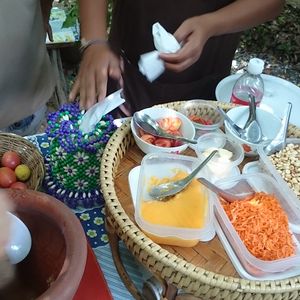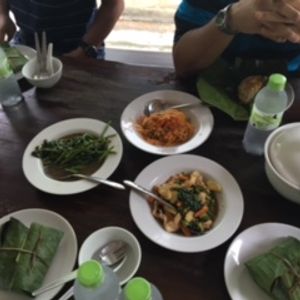 そして、あらかじめ準備してあったバナナの皮に包まれたチャーハン、スープなどといっしょに先ほどのソムタムと空芯菜を並べてみんなでランチタイムです!