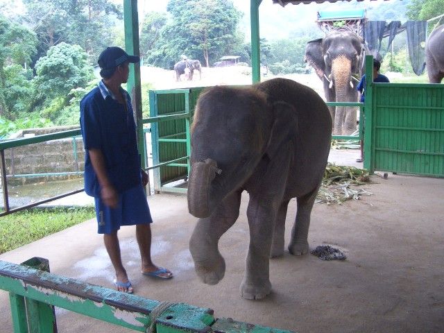 ガイドは付かなかったので、届けてもらったら下車後さぁさぁといった感じで、案内されました。まずは子象とのふれあいでしたが、これは触れ合いというのでしょうか…?2頭の子象がいる檻の中へ入れられ、子象がたかってくるのでわ~きゃ~っと騒いでいるところへ50バーツ要求されバナナの籠を渡されます。あっという間に食べられ終了。その間、カメラで様子を撮影してくれました。