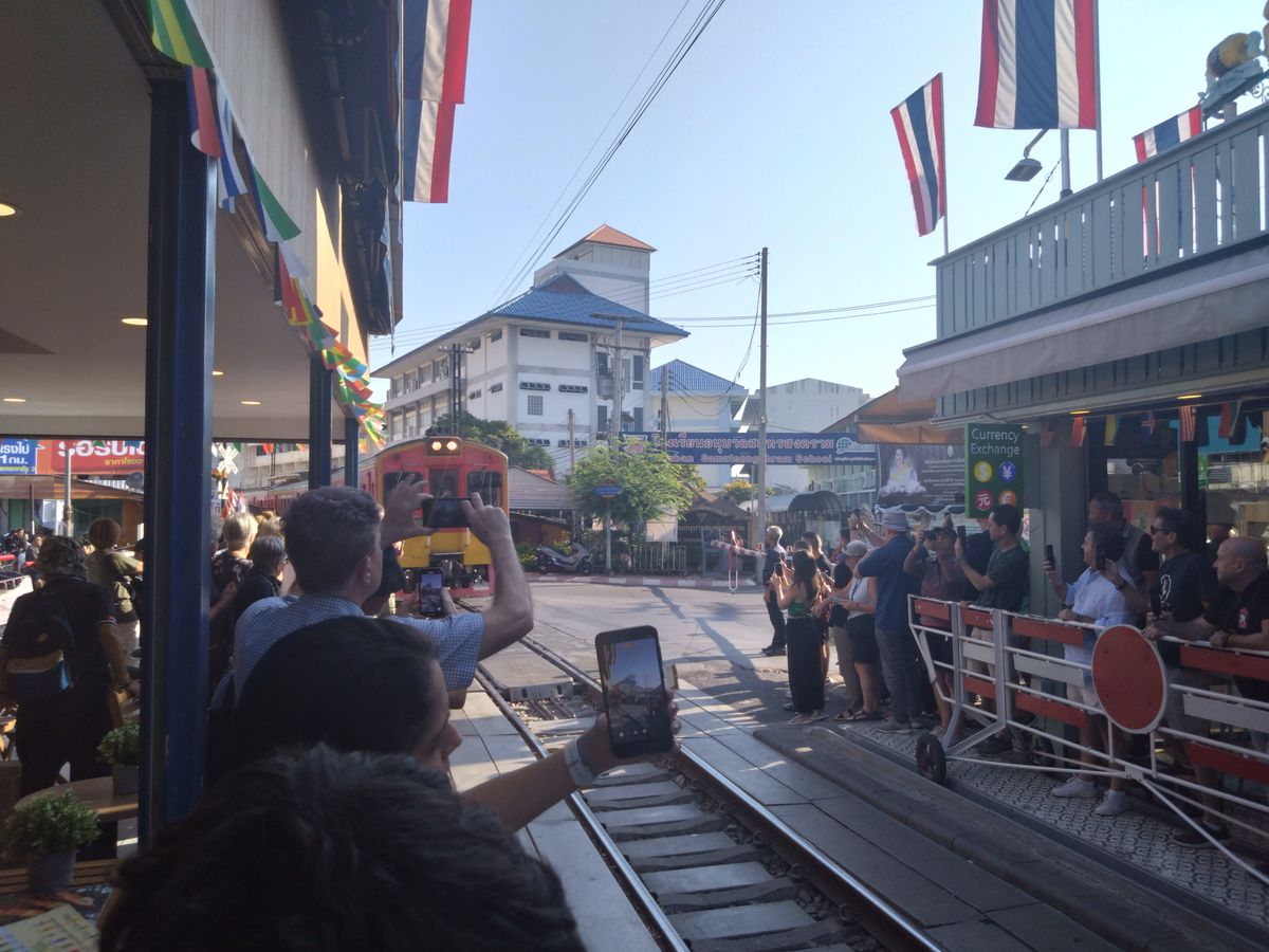 線路市場では、列車到着直前に観光客がバッと線路際に集まってきますので、線路沿いの茶店で飲み物を買って、線路際の席を確保しておくことをお勧めします。