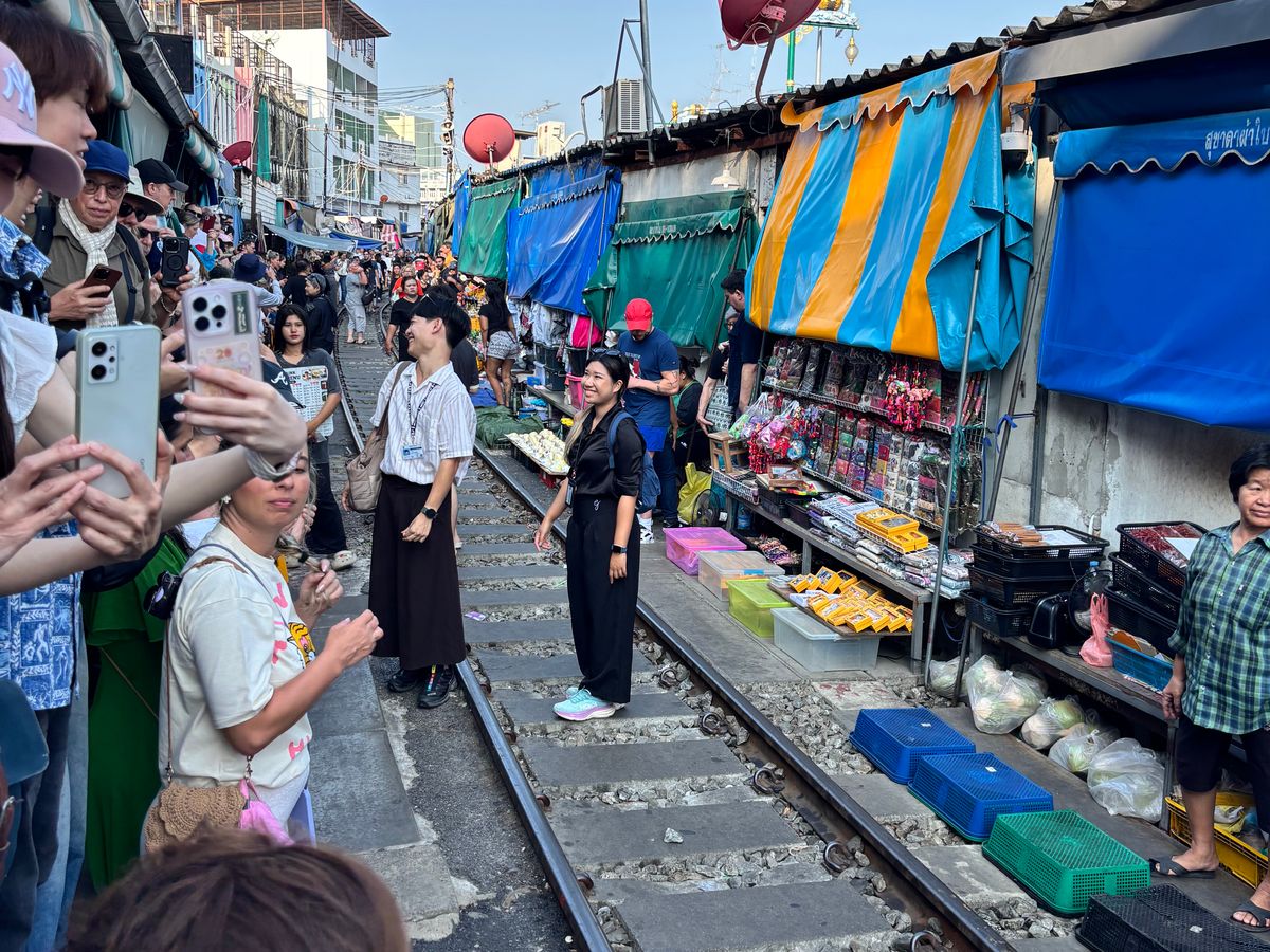 最初にメークロン市場、水上マーケット、お昼ご飯、アユタヤ遺跡、ゾウ乗り体験の順番で回りました。メークロン市場は、体の10cmぐらい前まで列車が来て、とても迫力がありました。また、実際に列車に乗ることができ、とても気持ちよかったです!