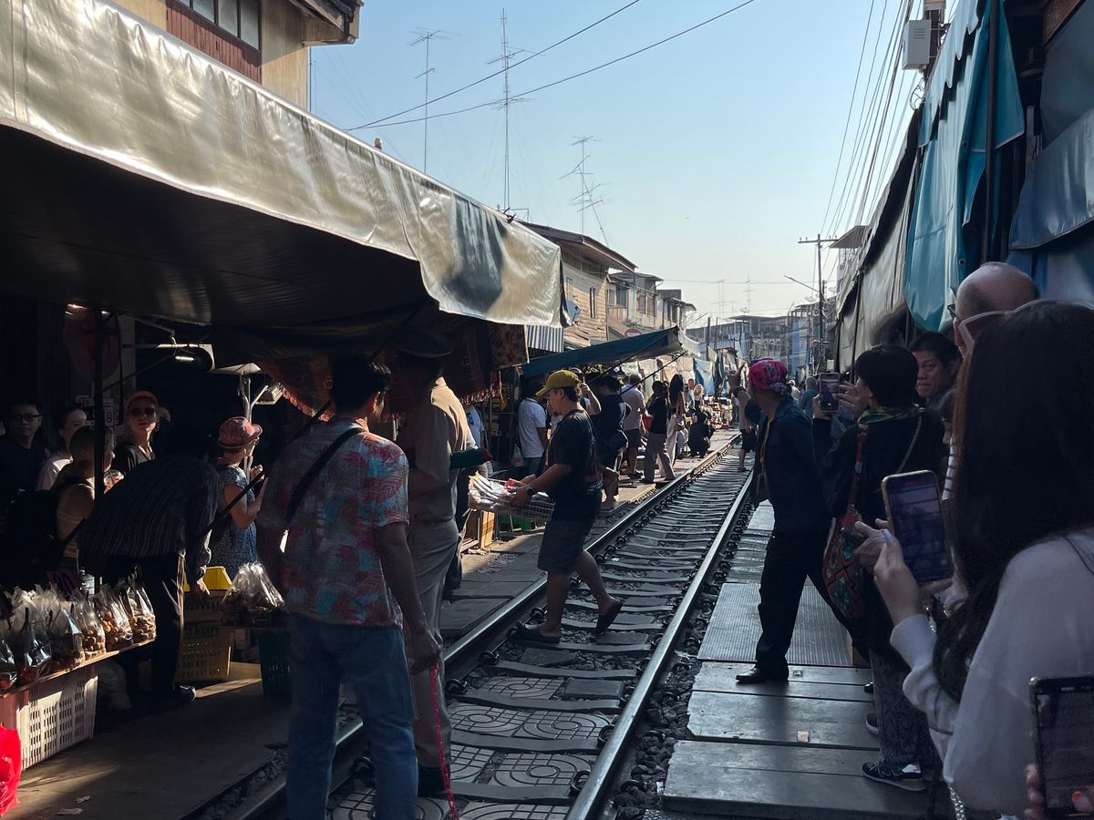 ずっと行きたかった憧れのメークロンでは目の前を通り過ぎる電車に感動!さらに電車に乗りこみ、電車の中から市場にいる他の観光客の方に手を振ったり交流する楽しさもありました。