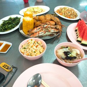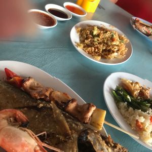空芯菜の炒め物やチャーハンは食べ放題、ひとりにシーフードメインのBBQがつきます。